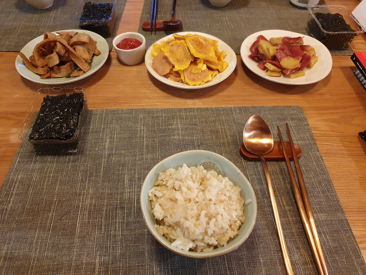 배웅을 마치고 집으로 돌아와 냉장고에 남아 호박이랑 두부를 이용해서 전을 부치고, 남아있는 밑반찬들도 점심을 차려먹었다. 마지막 점심이니까 푸짐하게, 잘 차려먹었다.