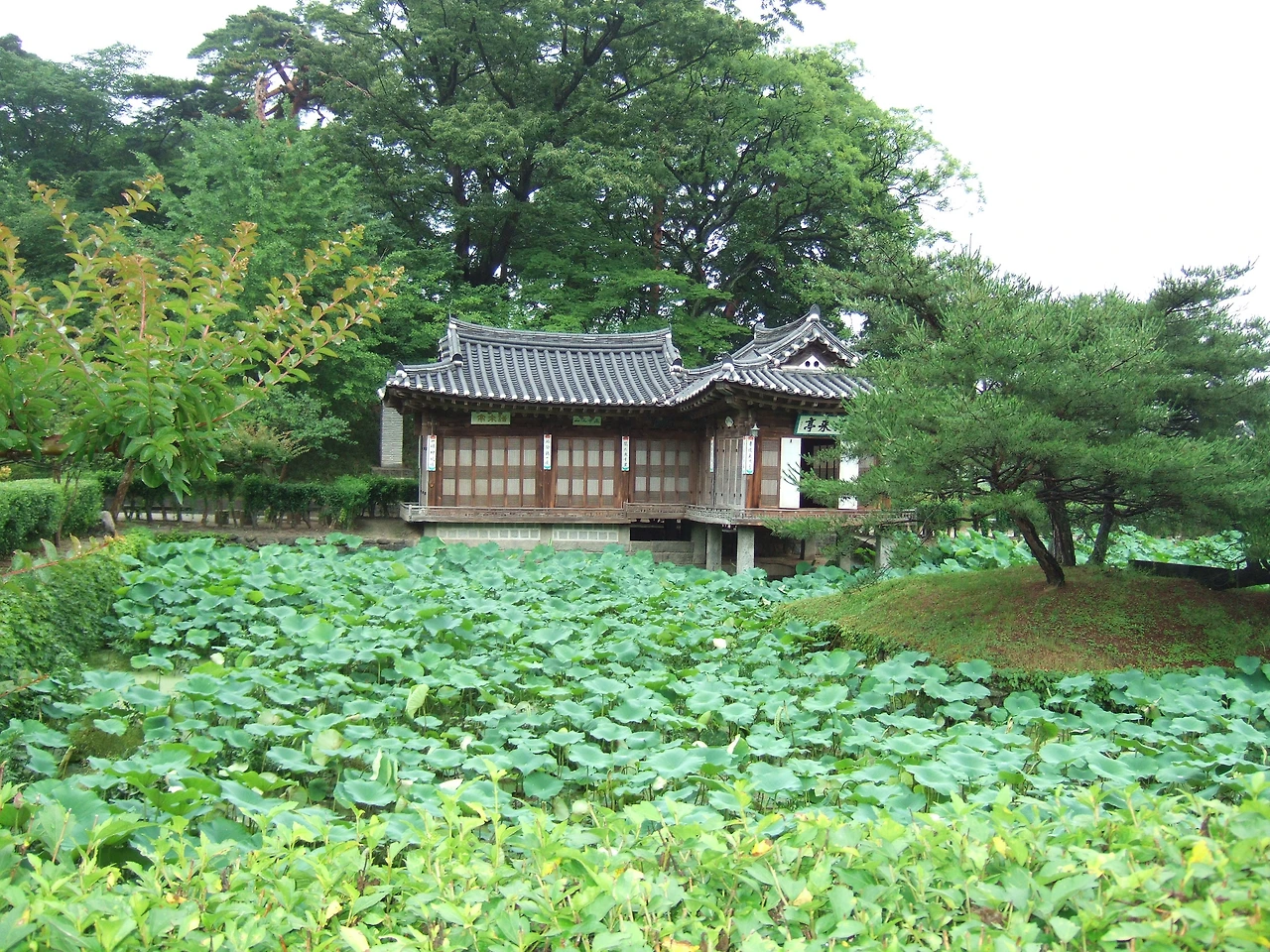 배를 타고 들어와야 했다고 해서 붙여진 船橋장... 비 내리는 선교장은 구경하는 사람들조차도 발걸음을 조심스럽게 만들 정도로 선교장에서 맑은 소리를 만들어 냈다. 원림에 가득가득한 연꽃들과 삐걱거리는 문.... 어느 틈엔가 문화 해설해주시는 분이 우리 옆에 붙어서 자세히도 설명을 해주신다. 그냥 양반집임을 느끼고 가야 했을 것을 그 느낌 속에 지식까지 얻어갈 수 있었으니 얼마나 행운인가?