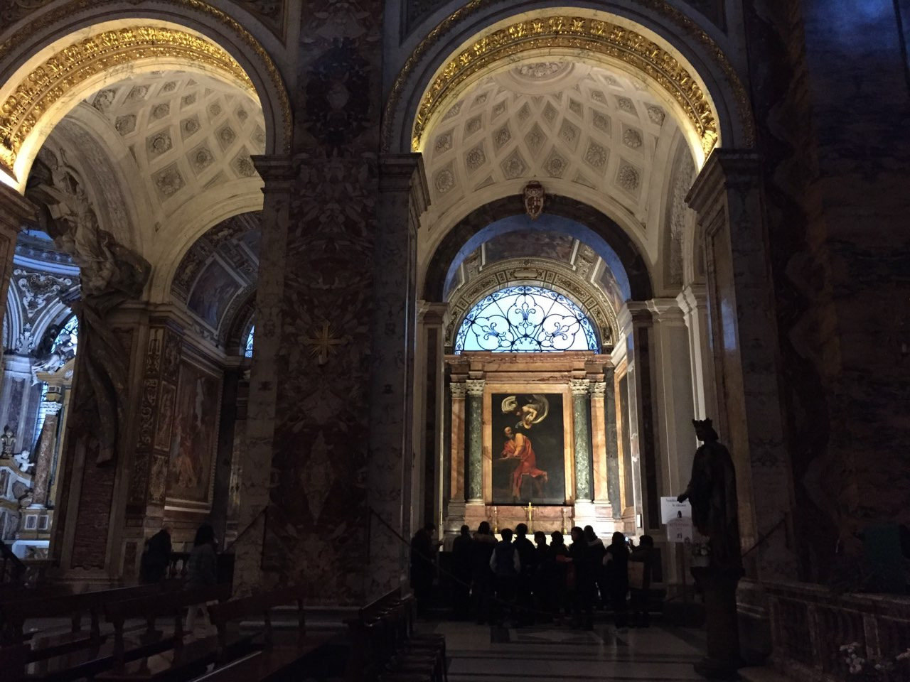 다시 자유시간이 주어져서 '산 루이지 데이 프란체시 성당을 갔습니디. 한때 프랑스 대사관으로 사용되었던 산 루이지 데이 프란체시 성당은 현재 프랑스의 국립 성당이며 프랑스 황제인 루이 9세를 위해 건립된 것입니다. 성당을 대표하는 것은 바로 '카라바조의 성 마테오 3부작'이다. 입구에서부터 왼쪽 5번째(마지막) 콘타렐리 예배당에 그려진 그의 작품은 성 마테오와 천사 (S. Matteo e l'Angelo), 성 마테오의 소환 (Vocazione di S. Matteo), 성 마테오의 순교 (Martirio di S. Matteo)로 구성되어 있었습니다.