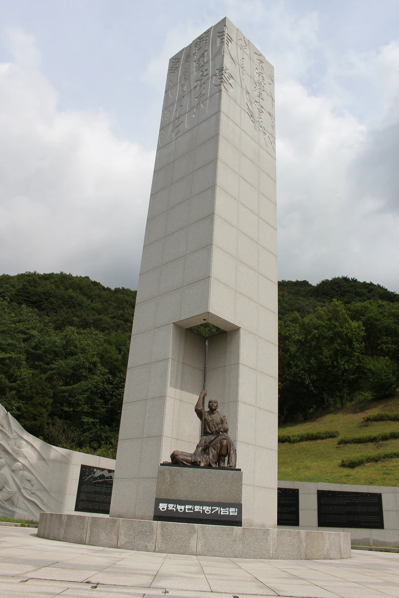 공원을 굽어보고 있는 산 중턱에 위치한 기념탑에는 동학농민군을 형상화한 동상이 있고 그 뒤로 높이 솟아오른 기념탑이 있는데 기념탑의 정상부에는 동학과 관련된 내용을 한자로 새겨놓았다. 기념탑 뒤쪽으로는 병풍을 두른 듯 돌벽을 세워놓고 그곳에 검은색 돌판을 넣어 동학과 관련된 역사적 기록들을 새겨 놓았다.