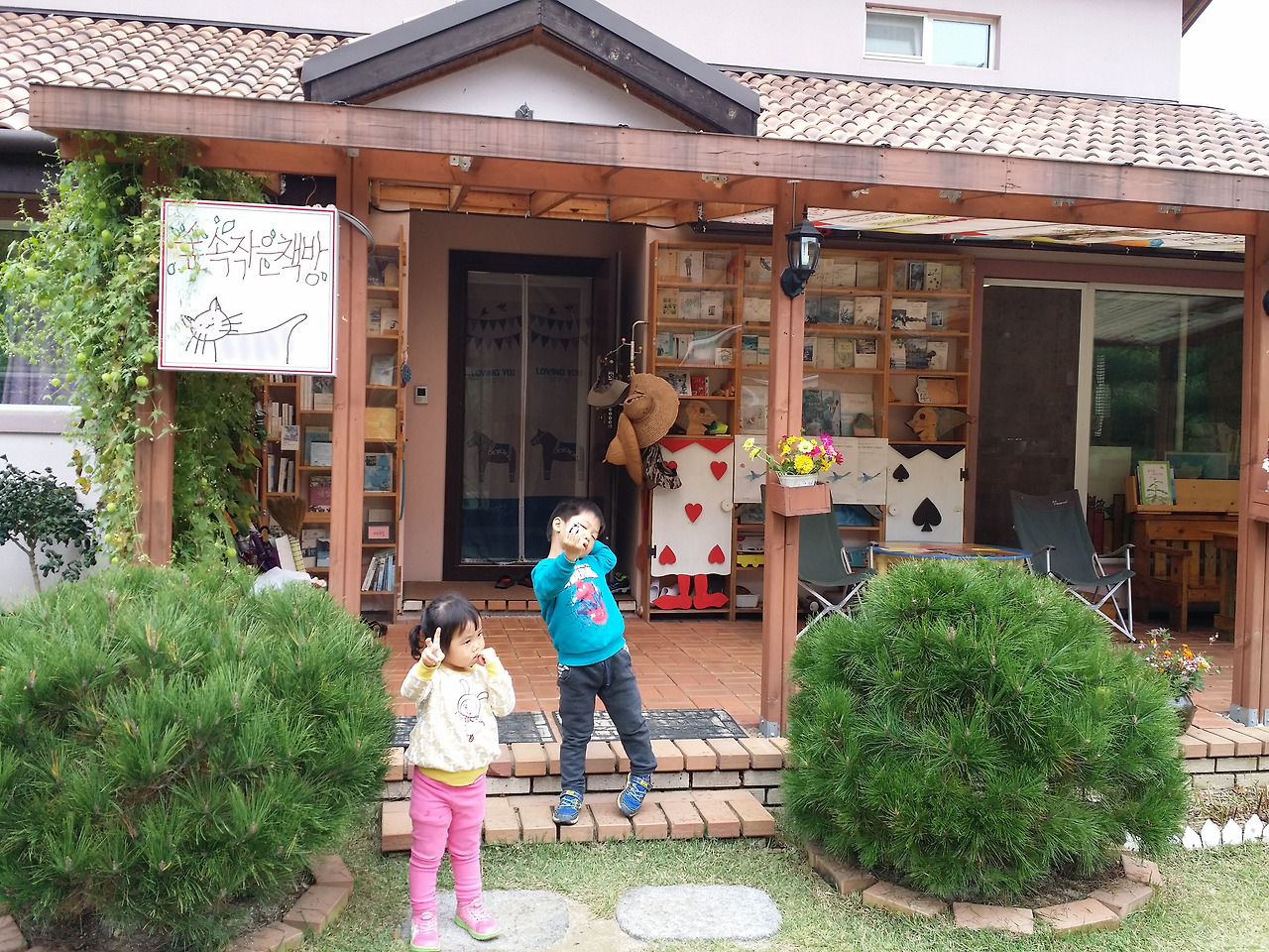 내가 찾아갈 곳은 '숲속의 작은 책방'이다. 마을앞 큰 공터에 세워진 높은 건물을 지나는 찰나에 오른편으로 조그맣게 간판이 보였다. 차를 후진해서 세운 다음 애들을 데리고 집으로 들어갔다. 약간의 비는 왔지만 우산을 쓸 정도는 아니였다. 남자가 애들을 데리고 가는 모습이 신기했는지 밑에 집 어르신은 자꾸만 나를 쳐다보았다.