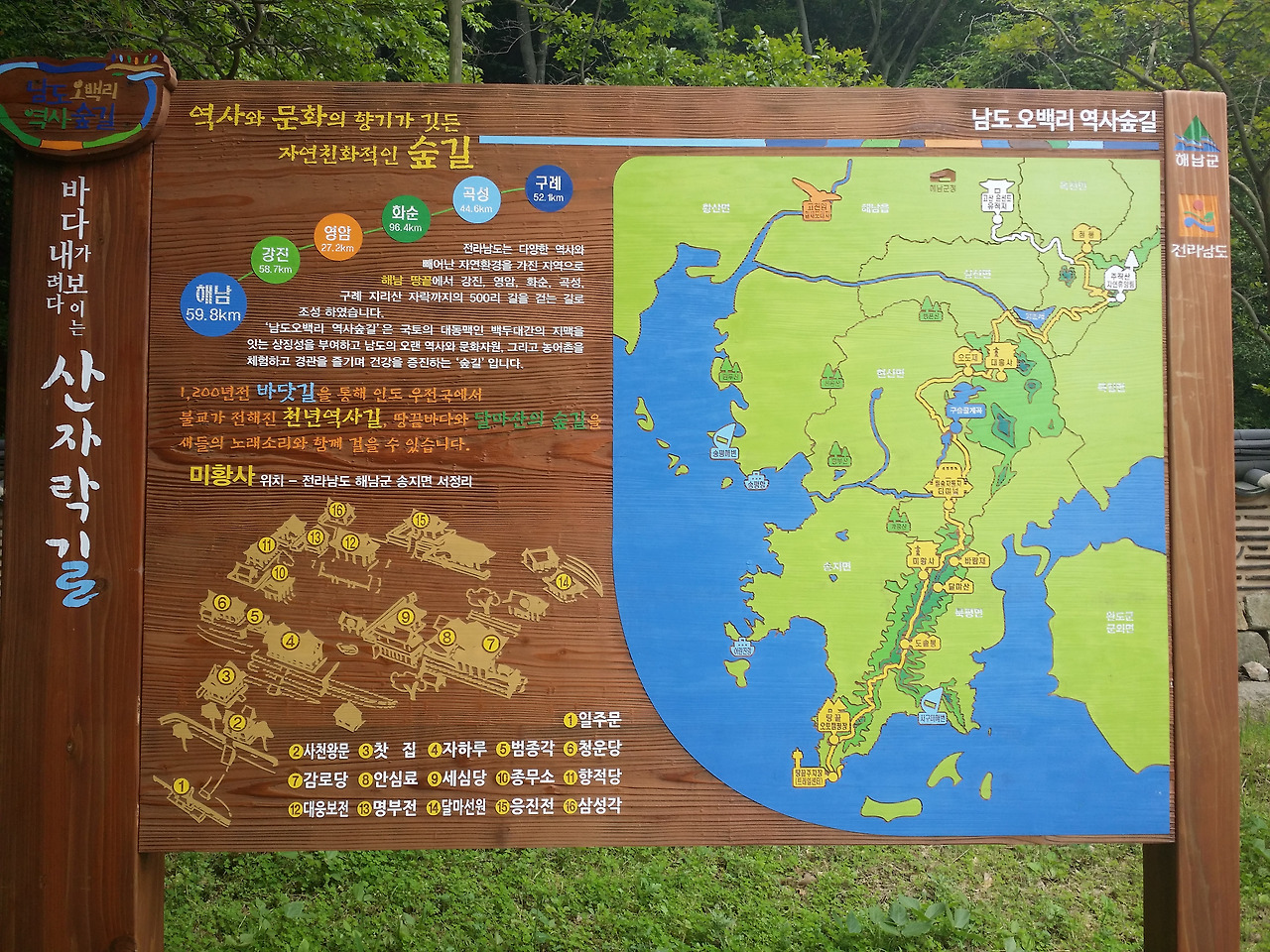 오늘의 목적지는 달마산을 한바퀴 도는 달마고도이다. 달마산 입구에 들어서서 미황사로 가는 길은 속세의 공기와는 전혀 다른 느낌이었다. 창문을 여는 순간 달마산 숲이 만들어낸 공기는 상쾌함으로 온몸을 붕뜨게 하는 느낌을 주었다. 속세에는 에어컨 바람이 있다면 달마산에는 솔바람이 있었다.