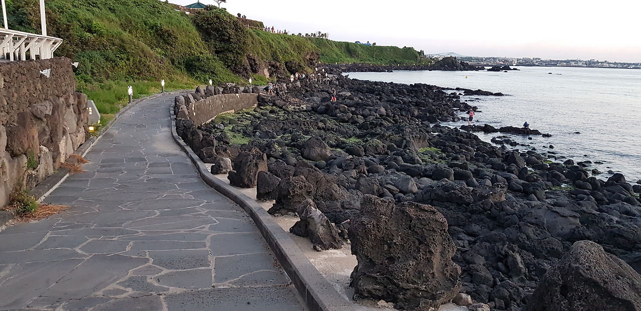 노을을 보고 해변을 따라 숙소로 걸어왔다. 딸은 힘들어 업고 걷기를 반복했다. 산책로는 용암이 굳어 다양한 모양을 하고 있어 걷는 즐거움을 주었다. 까만 밤바다에는 아직도 해수욕을 즐기는 사람들, 해변 산책을 즐기는 사람들이 많았고 먼 바다에는 집열등을 환하게 켠 배들이 줄을 지은 듯 있었다. 바닷가 포장마차에서는 한치회와 함께 웃음이 넘쳐나고 있었다.