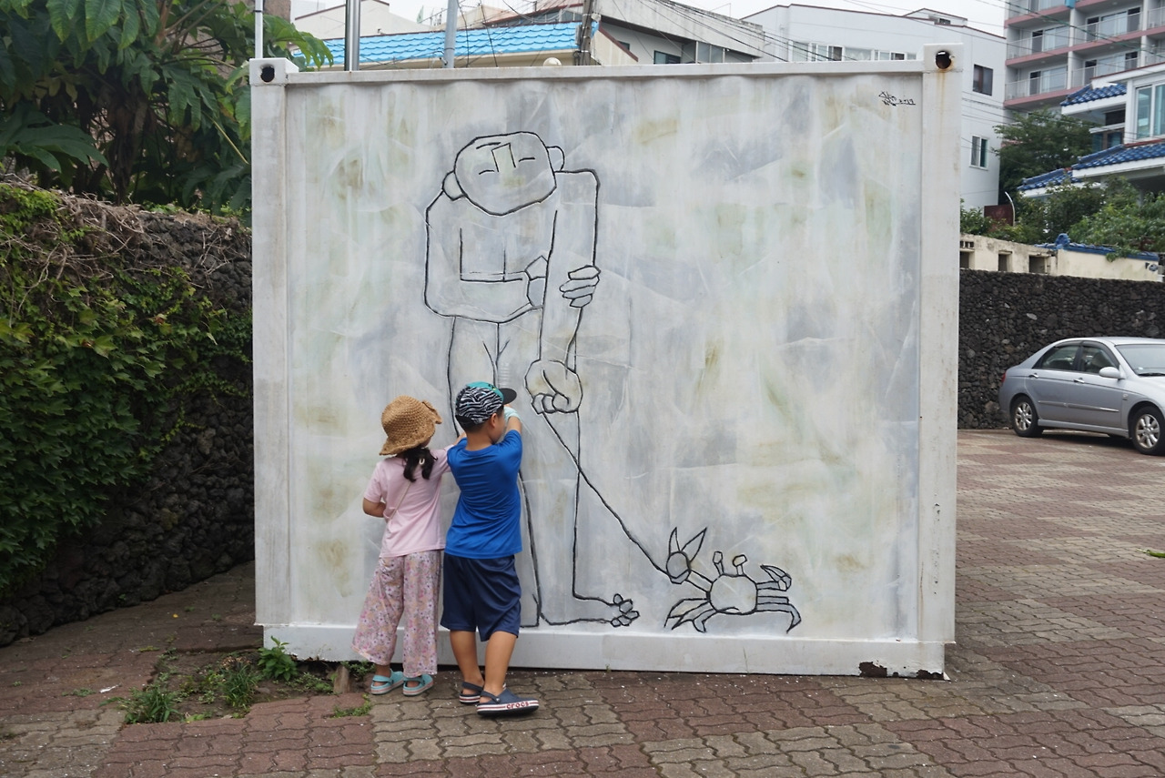 시장 길건너는 바로 이중섭거리였다. 이쁜 소품을 파는 가게들과 벼룩시장같은 것들이 있어서 걷는데 지루함은 없었다. 딸은 예쁜 하얀 토끼가 붙어있는 작은 가방을 샀고 아내는 제주도 느낌나는 손거울을 샀다. 아들은 제주에 와서 아낀 돈과 점수로 팽이를 샀다. 나는 동백이 그려진 에코백을 하나 사고 싶었다. 그러나 마음에 드는 것을 제주를 떠날때까지 구하지 못했다.