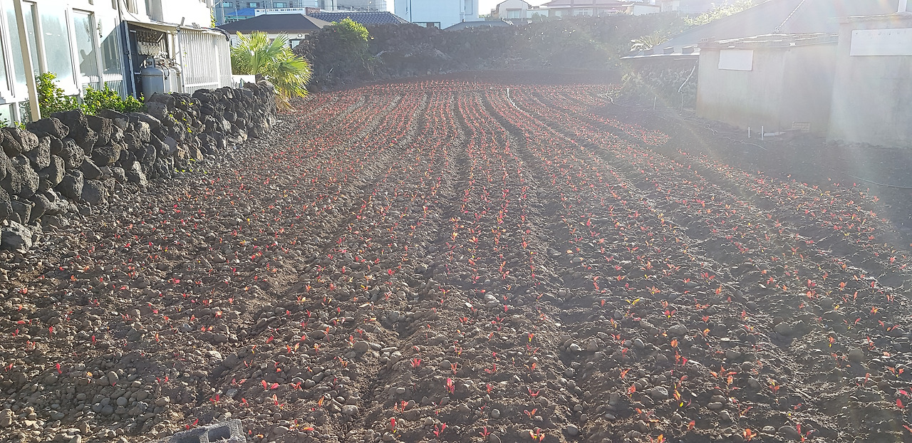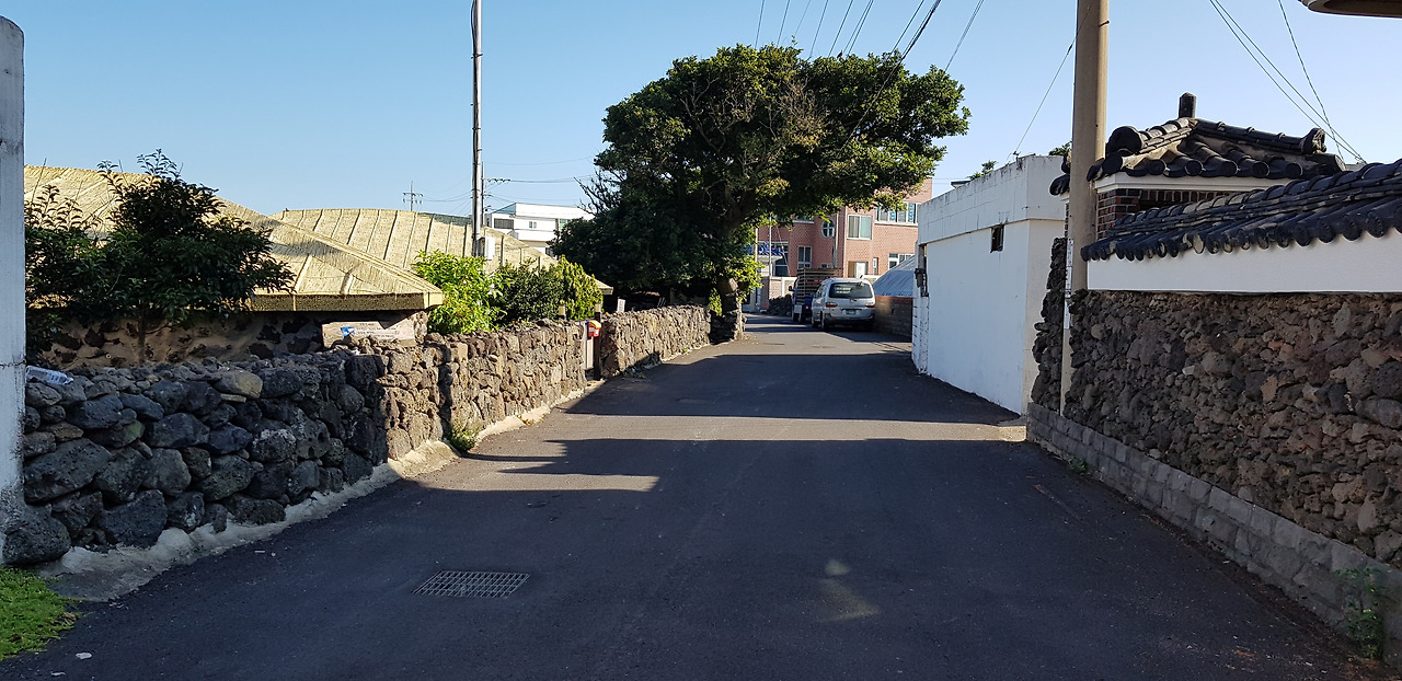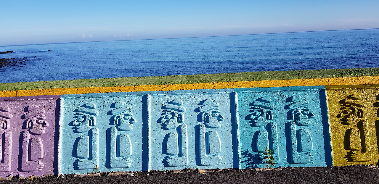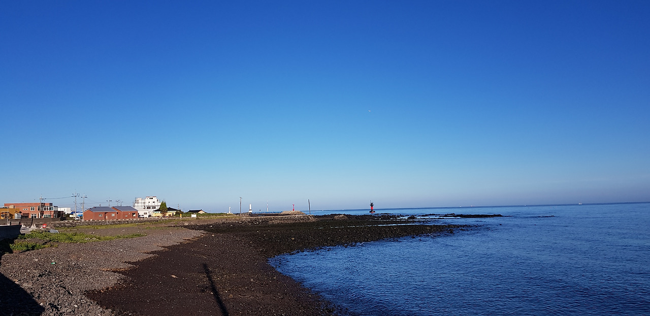 1길 중간쯤에는 마을분리수거장이 있고 그 40도 각도쯤에 하얀 페인트칠이 된 작은 집이 있는데, 카페를 하려는 모양이였다. 그러나 우리가 떠날때까지 오픈하는 것을 보지 못했다. 1길 끝은 바다다. 바다와 육지의 경계는 하루방 조각들이 모아이처럼 지키고 있었다.