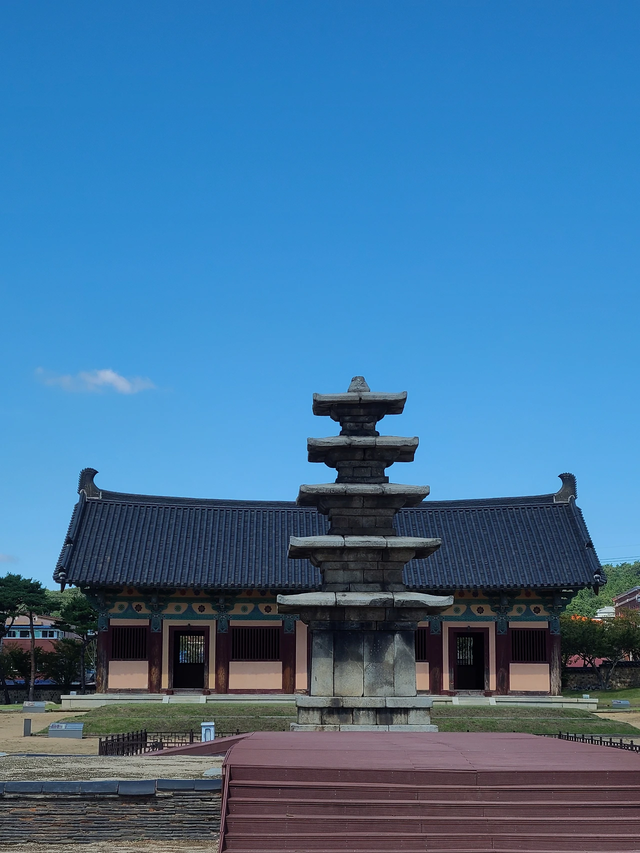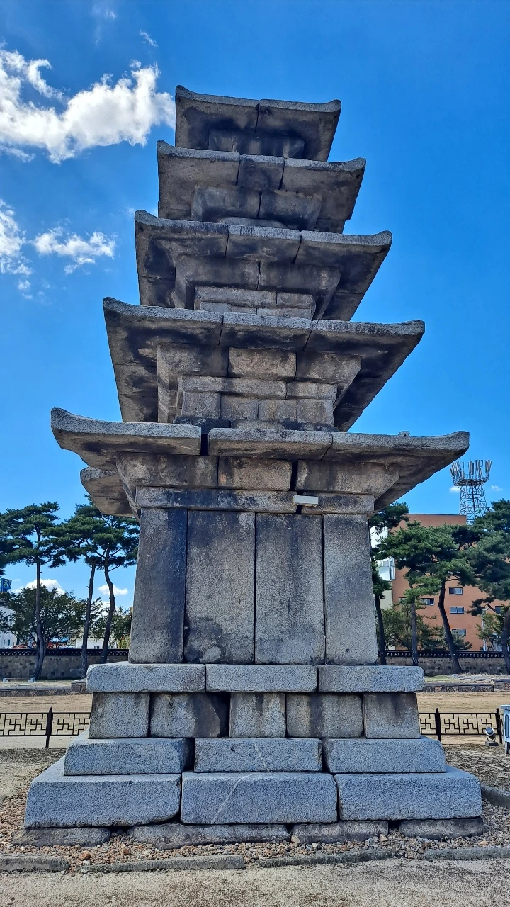 매표소에서 입장권을 구입하고 들어서는 순간 이런 석탑의 아름다움이라니. 텅 빈 마당에 솟아 있는 석탑은 백제 장인들의 명품이었다. 확연히 신라의 탑과는 다른 세련미가 있었다. 크게 멋을 들이지 않고 살짝 들어 올렸는데 멋진 춤사위가 되는 것과 같은 느낌이었다. 5층의 석탑이지만 하늘을 침범하지 않았고 그렇다고 땅으로 숨지도 않았다. 유홍준 교수가 추사와 원교의 글씨를 비교하면서 추사는 완자와 비슷하고 원교는 칼국수 면발과 비슷하다고 한 적이 있다. 정림사지 5층 석탑을 보는 순간 내가 느낀 것은 아 이거 추사체와 비슷하다 였다. 감상은 지극히 개인의 영역이고 강요해서는 안되지만 비교해서 보시면 그전에 알고 보던 탑과는 다른 모습이 보일 것이라 자부한다. 특히
