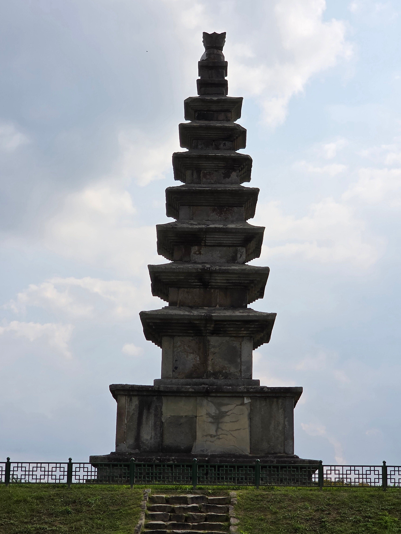 통일신라시대 유일한 7층석탑이며, 크기도 14.5m로 가장 크다. 흙단 위에 올려져 있으니 실제로는 더 커 보인다. 일제강점기에 무너질 위험이 있어서 해체 복원하였는데 이때 탑 안에서 여러 유물들이 나왔다고 전해진다. 아쉬운 점은 이때 제대로 복원하지 못해서 원래 모습을 잃었다고 한다. 지금도 탑이 불안하게 서 있어 언젠가는 다시 복원해야 할 것이다. 이 탑 앞에는 석등 아랫부분이 남아 있어 이곳이 절터였음을 알려준다. 그런데 금당보다 더 높게 탑을 쌓았다는 점에서는 이해가 안 된다. 과연 절일까 아니면 다른 목적으로 만든 것일까.