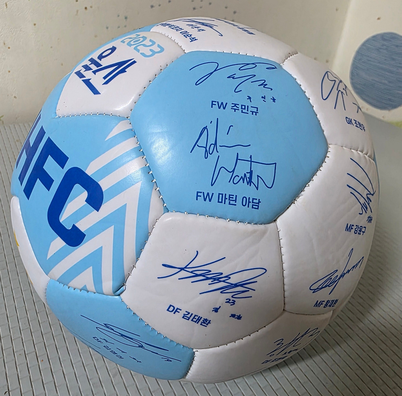 지극히 평범한 부모님과 유명 선수로는 보이지 않는 소박함이 첫인상이었다. 이런저런 이야기를 하고 나서 주민규 선수가 직접 나에게 동생과 같은 학년의 부장이라며 사인볼을 하나 주셨다. 약간의 특혜를 받는 기분이었다. 내가 학년 부장이지만 담임들의 도움을 받아야 하는 입장이고 담임들이 생활하는데 크게 도움을 주는 입장도 아니었기에 약간은 민망한 마음도 있었다.