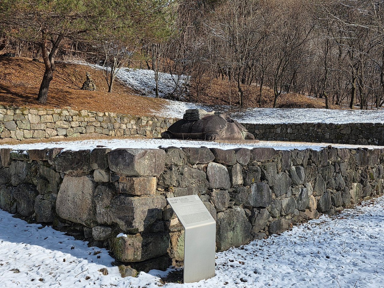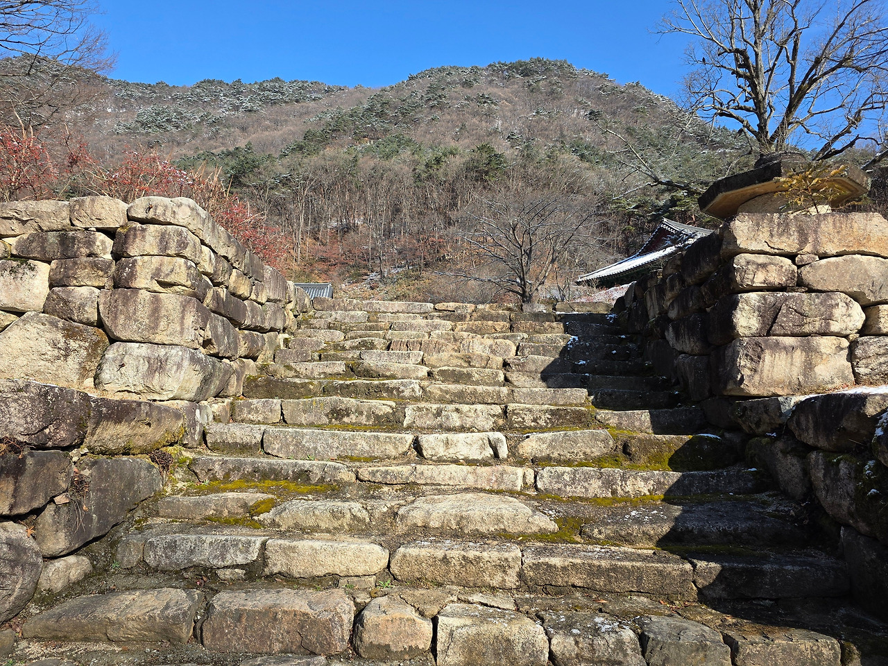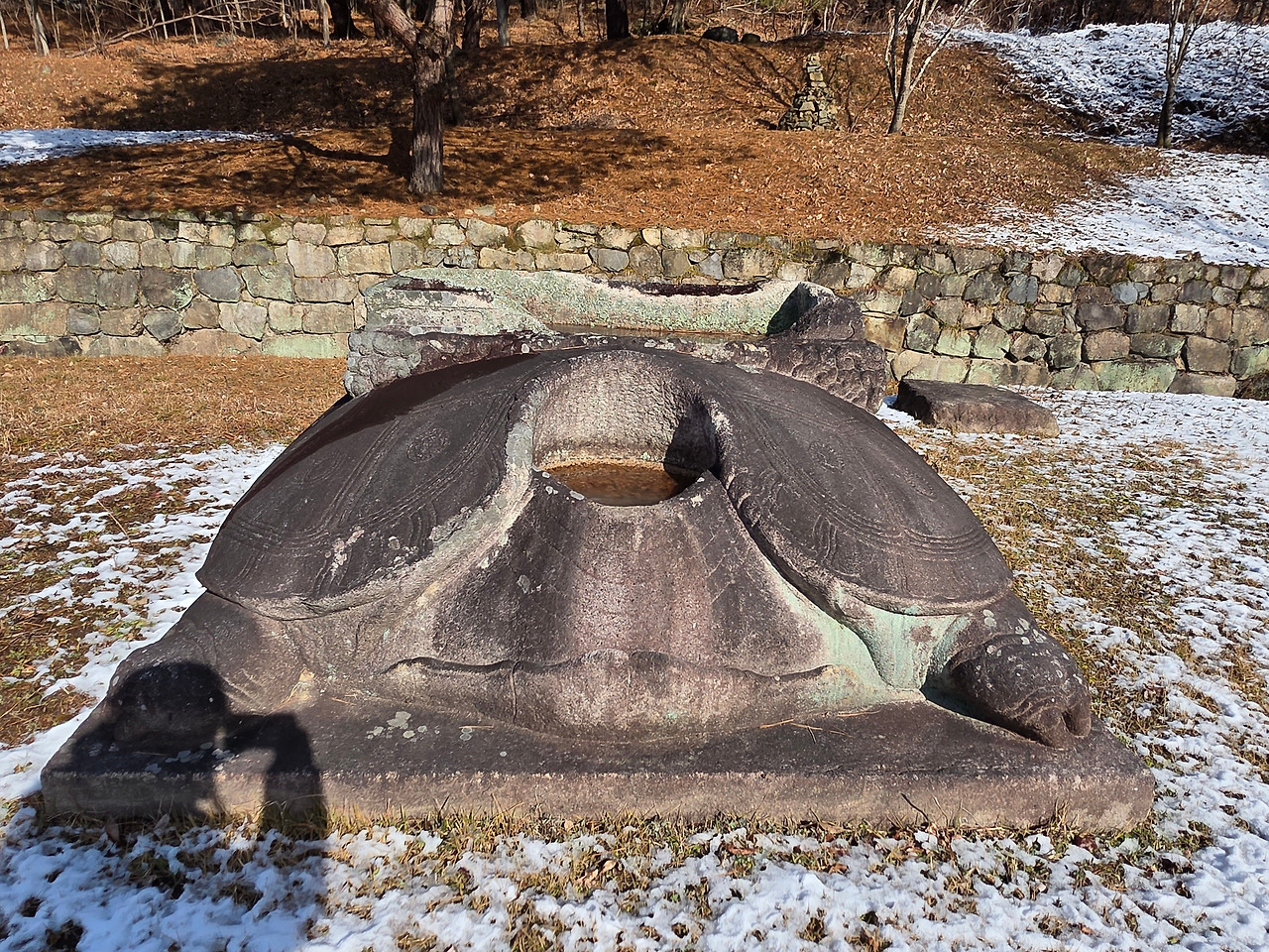 비로전을 지나면 칠보산을 등산하는 입구가 있다. 겨울 한 달 동안은 입산 통제를 하고 있었다. 그 위로 각연사를 더 빛나게 하는 보물들이 있다. 머리와 비신은 없지만 남겨진 조각만으로도 그 정교함을 따라갈 수 없는 귀부가 등산로 왼편으로 작은 개울을 지나면 나타나는 넓은 대지에 자리 잡고 있다. 다시 돌아와 등산로를 따라가다 보면 부도도 보이고 통일대사 탑비와 통일대사 탑이 산 중에 있다.
