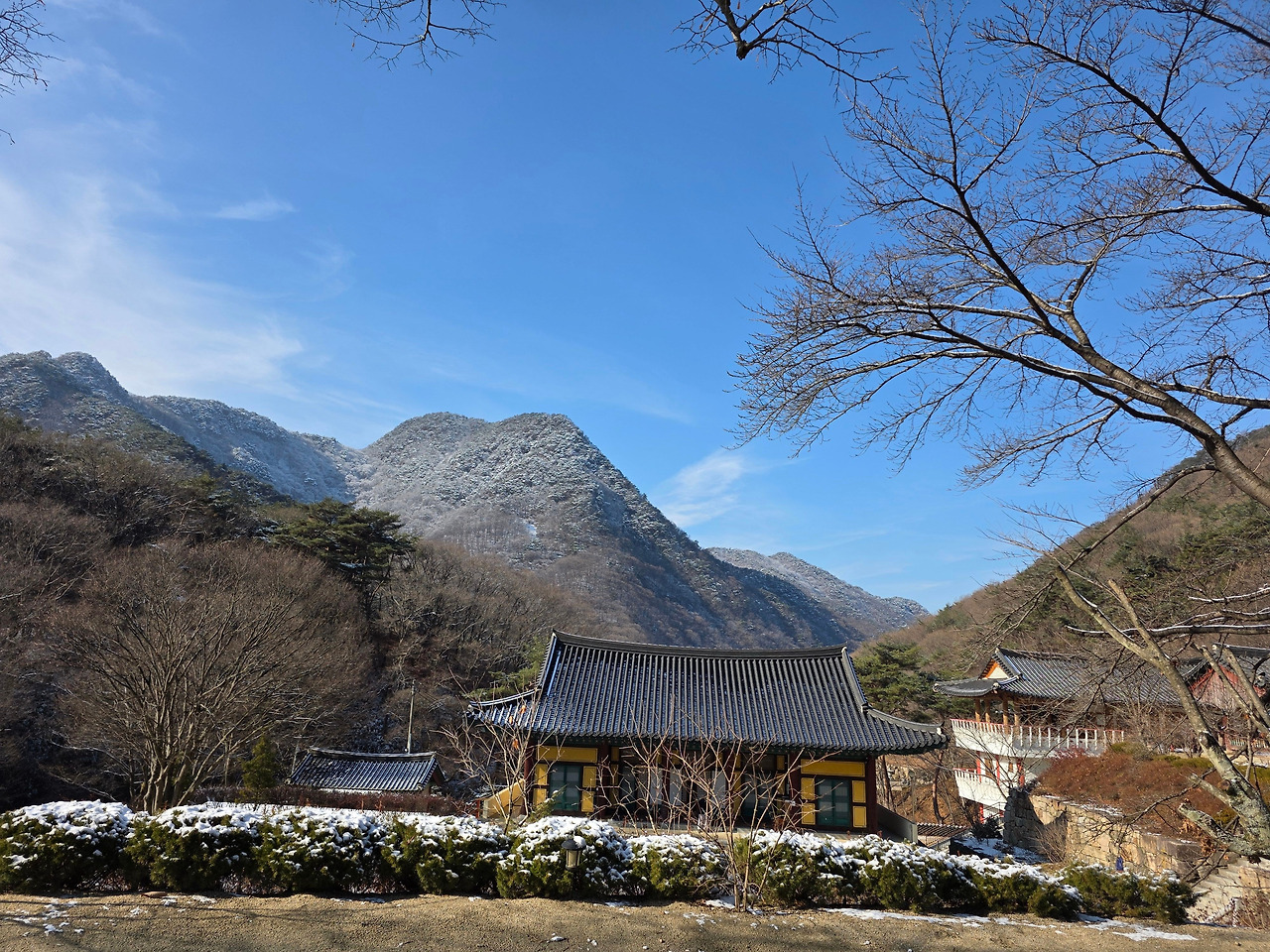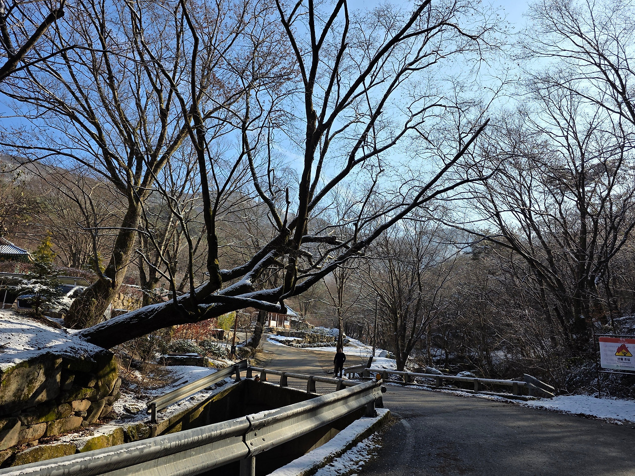 각연사로 가는 길은 예전보다 잘 정리되어 깔끔한 느낌을 주지만 나는 예전 정리되지 않은 멋스러움을 잊지 못한다. 비가 오면 도로를 따라 흘러내리는 덜 포장된 길을 따라 각연사로 가던 그 느낌이 부처님을 만나러 가는 마음과 같았기 때문이다. 그럼에도 불구하고 각연사로 가는 길은 예쁘다. 계곡을 끼고 난 길도 이쁘지만 도로가 좁아 양 옆의 산들이 거의 붙어있다 시피해서 여름이면 하늘도 초록초록하다. 어떤 구간은 나무들이 서로를 감싸고 있어 초록 터널을 만들고 있으니 어찌 각연사 가는 길을 사랑하지 않을 수가 있을까. 겨울에는 앙상한 가지들이 닿을 듯 말 듯하면서 겨울을 의지하고 있었다.