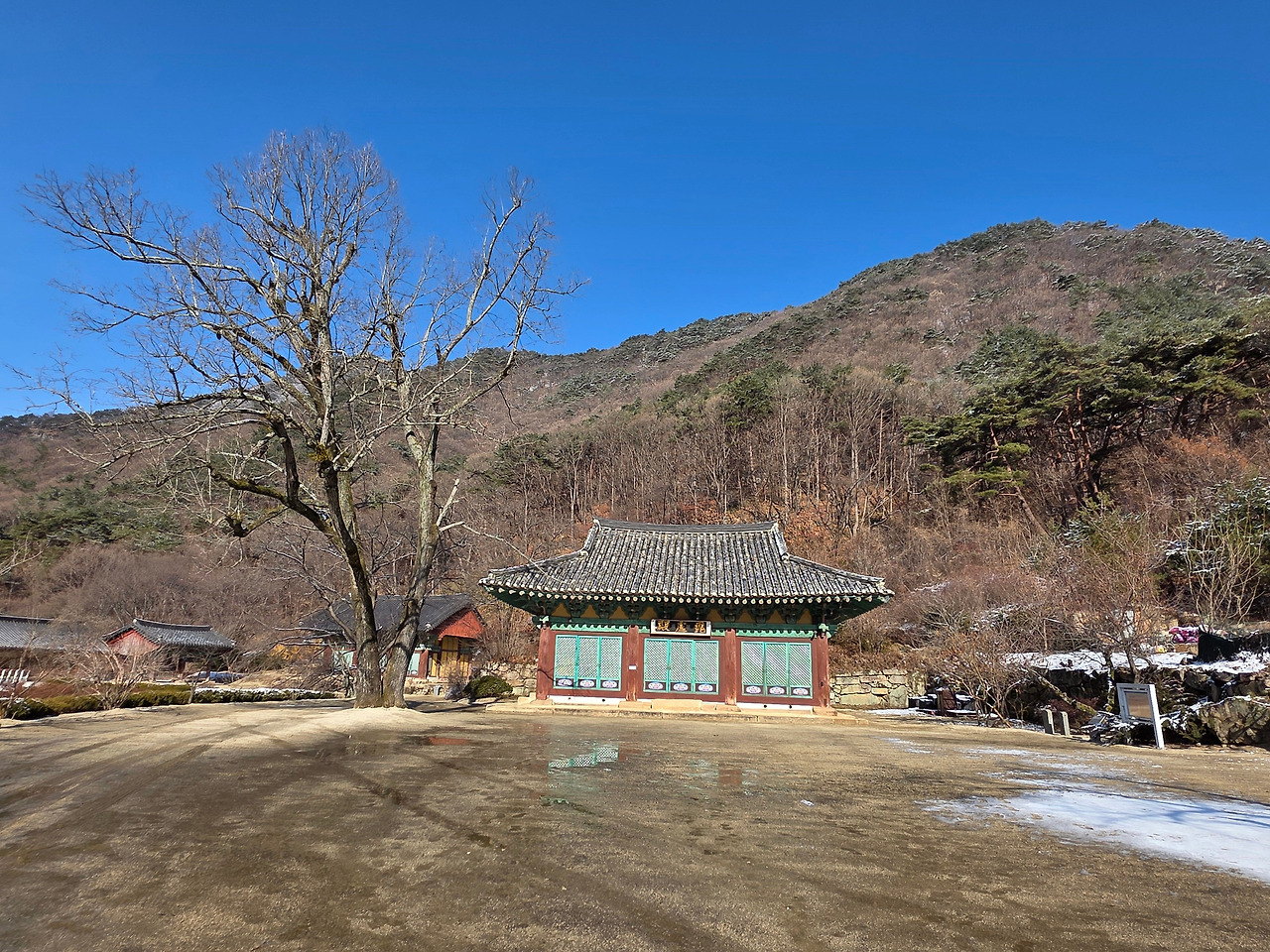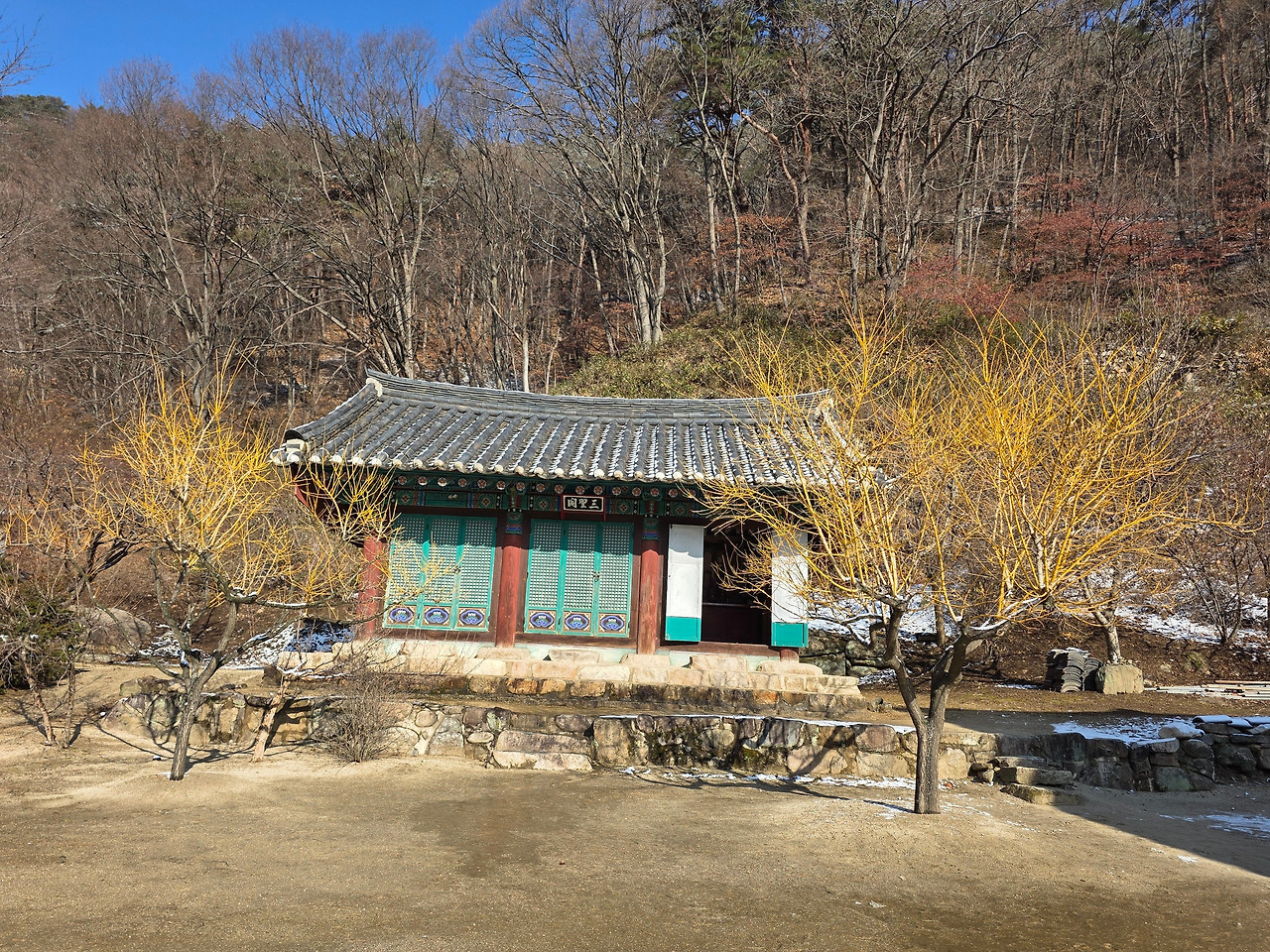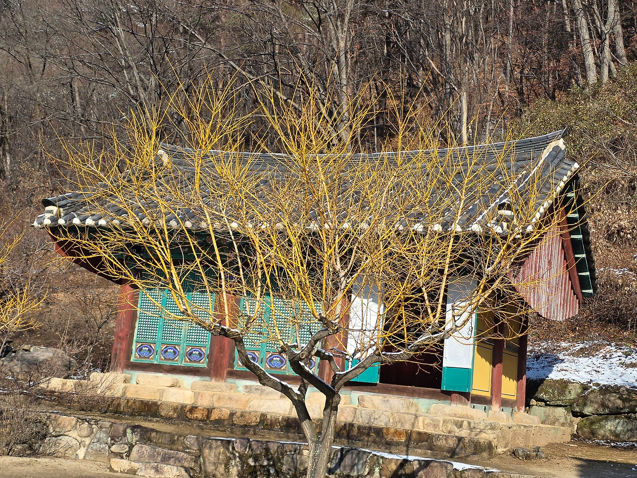 그런데 여러 번 각연사를 왔는데 이번에 처음 본 것이 대웅전 옆 삼신각 앞에 있는 황금회회나무 두 그루였다. 가지 부분이 순록의 뿔처럼 느껴졌고 뿔들은 황금빛으로 빛나고 있었다. 처음 보는 나무라 검색해 보니 황금회화나무였다. 회화나무는 학자수라고 불리며 향교나 서원 등에 심었다. 그런 회화나무가 각연사에서 자라고 있었다. 어디를 가든 4계절을 만나 보아야 한다는 말을 실감하게 되었다.