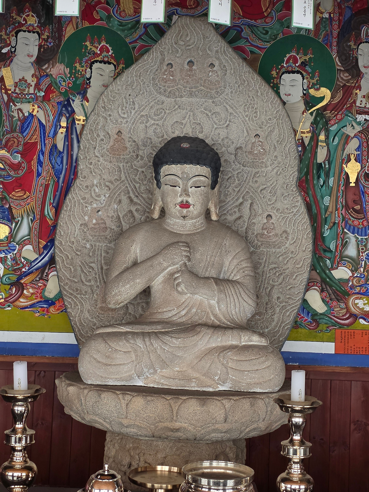 대웅전으로 올라서는 두 번째 계단은 첫 번째 계단과 달리 잘 깎은 돌로 만들어져 있어 예스러움을 잃었지만 계단 옆 난간은 옛 돌로 채워져 있어 각연사의 오래됨을 알 수 있게 해 준다. 각연사 대웅전은 조선후기에 만들어졌으며, 대웅전 안에는 통일대사 모양을 한 스님 조각이 새겨져 있다. 예전에는 유일대사라고 한 것 같은데 이번에 가보니 통일대사라고 안내판에 적혀 있었다. 보통 다른 절에는 절을 만든 사람을 조각해서 불상과 함께 두지 않는데 각연사는 여러모로 볼거리가 많다.