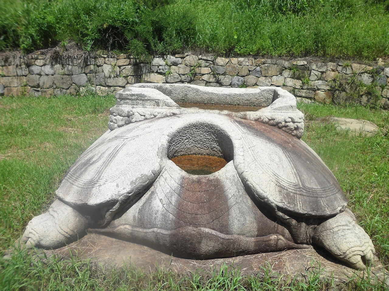 각연사를 지나 계곡을 따라 오르다가 두 번째 계곡을 만나 큰 바위로 된 징검다리를 건너면 넓은 터가 나온다. 옛날에 밭으로 이용되었을 법한 넓은 들에는 귀부(충청북도 유형문화재 212호)가 하나 있다. 들에는 풀이 어른의 허리만큼 커있어 누군가가 길을 만들어 놓지 않았다면 찾아갈 엄두도 내지 못했을 것이다. 설마 이곳에 귀부가 있을까 조심스럽게 다가서니 돌담장 안 기단 위에 거북이가 있었다. 거북이의 비신과 머리는 사라져 버려 주인을 알 수는 없지만 4개의 다리와 꼬리는 또렷하게 남아 있었는데, 튼튼하고 날카로워 당장이라도 기어 다닐 듯했다. 거북이 등무늬는 4각형과 6각형이 좌우 대칭을 이루고 그 안에 꽃무늬를 장식해 놓아 화려한 느낌을 준다.