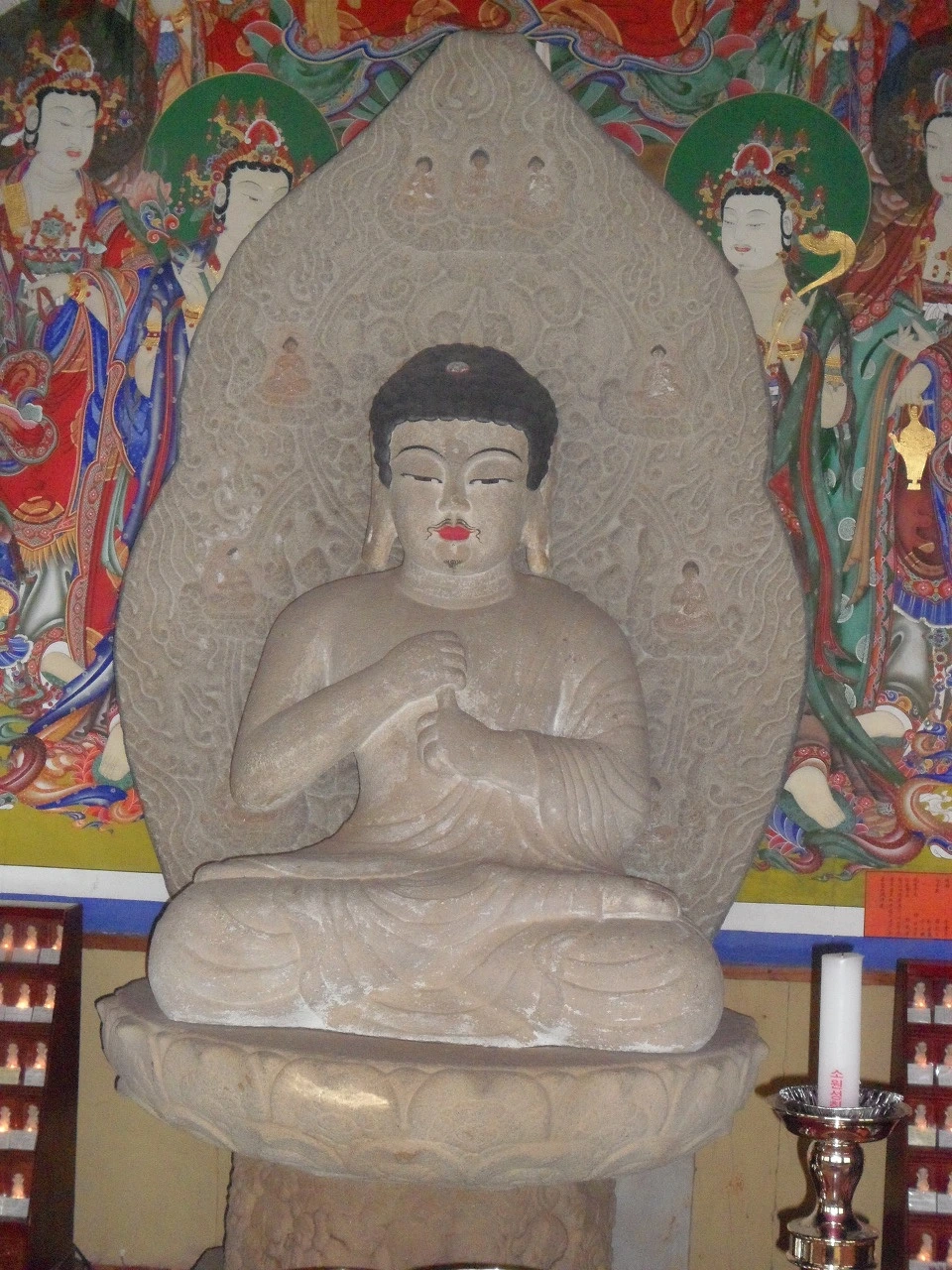 이 불상은 부처가 앉은 자리인 대좌와 몸 전체에서 나오는 빛을 형상화한 광배가 모두 있는 완전한 형태이다. 머리에는 작은 소라 모양의 머리칼을 붙여 놓았다. 오른쪽 어깨를 드러내고 왼쪽 어깨에만 걸친 옷자락은 주름이 간략하게 표현되었고 손은 왼손 검지를 오른손으로 감싸고 있는데, 전체적으로 조용하고 편안한 느낌을 준다. 불상의 광배는 전체적으로 물방울 모양이다. 광배를 살펴보면 머리 위쪽에 3구의 작은 부처와 그 아래 양쪽으로 각각 2구의 작은 부처가 새겨져 있다. 안쪽에서부터 연꽃무늬와 구름무늬가 새겨졌으며, 가장자리는 타오르는 불꽃을 표현하였다.