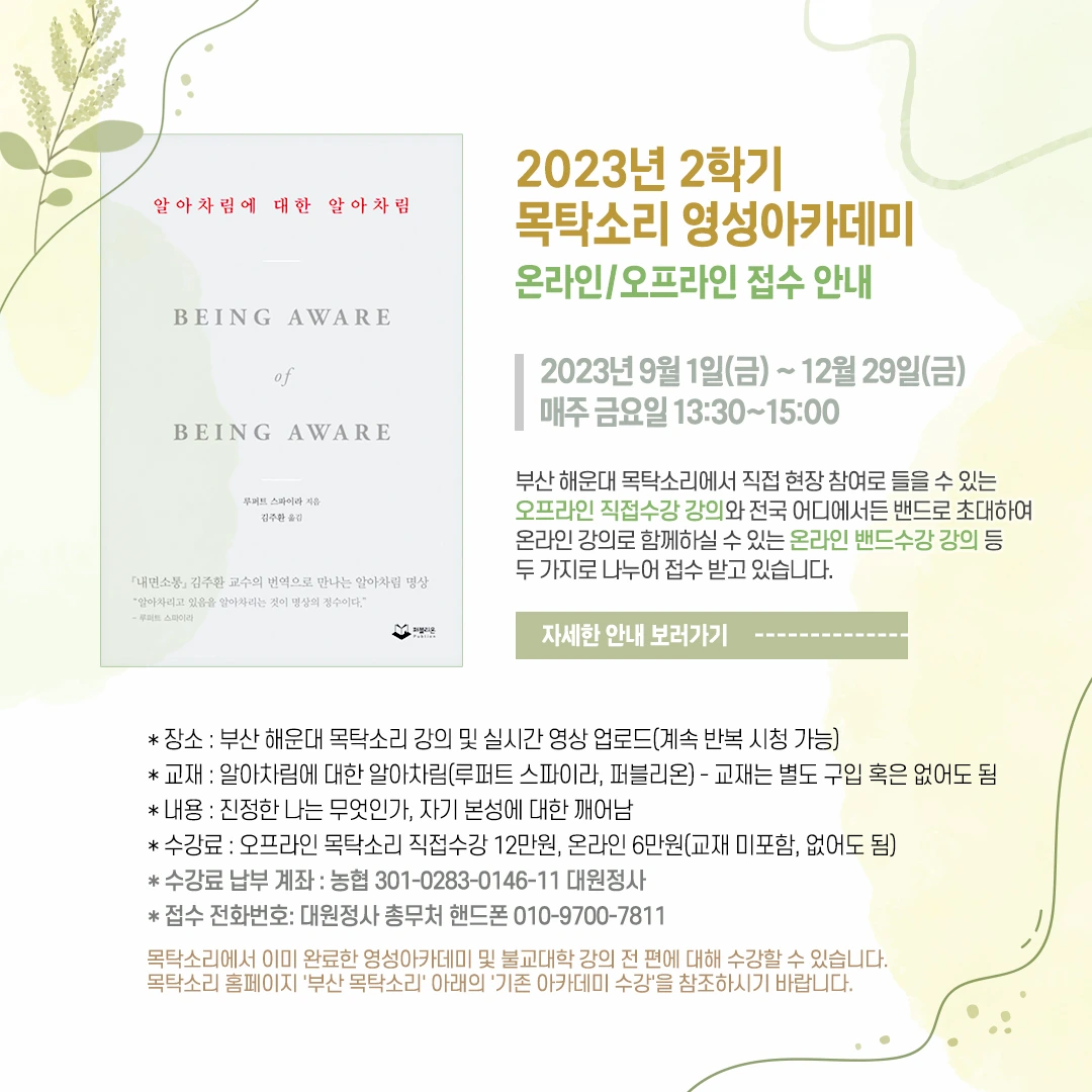 21년 22년 불교대학과 영성아카데미를 수강하지 않으셨던 분들 중 지금이라도 공부하기를 원하시는 분은 목탁소리 홈페이지 '부산 목탁소리' 아래의 '기존 아카데미 수강'을 참조해 주시기 바랍니다.