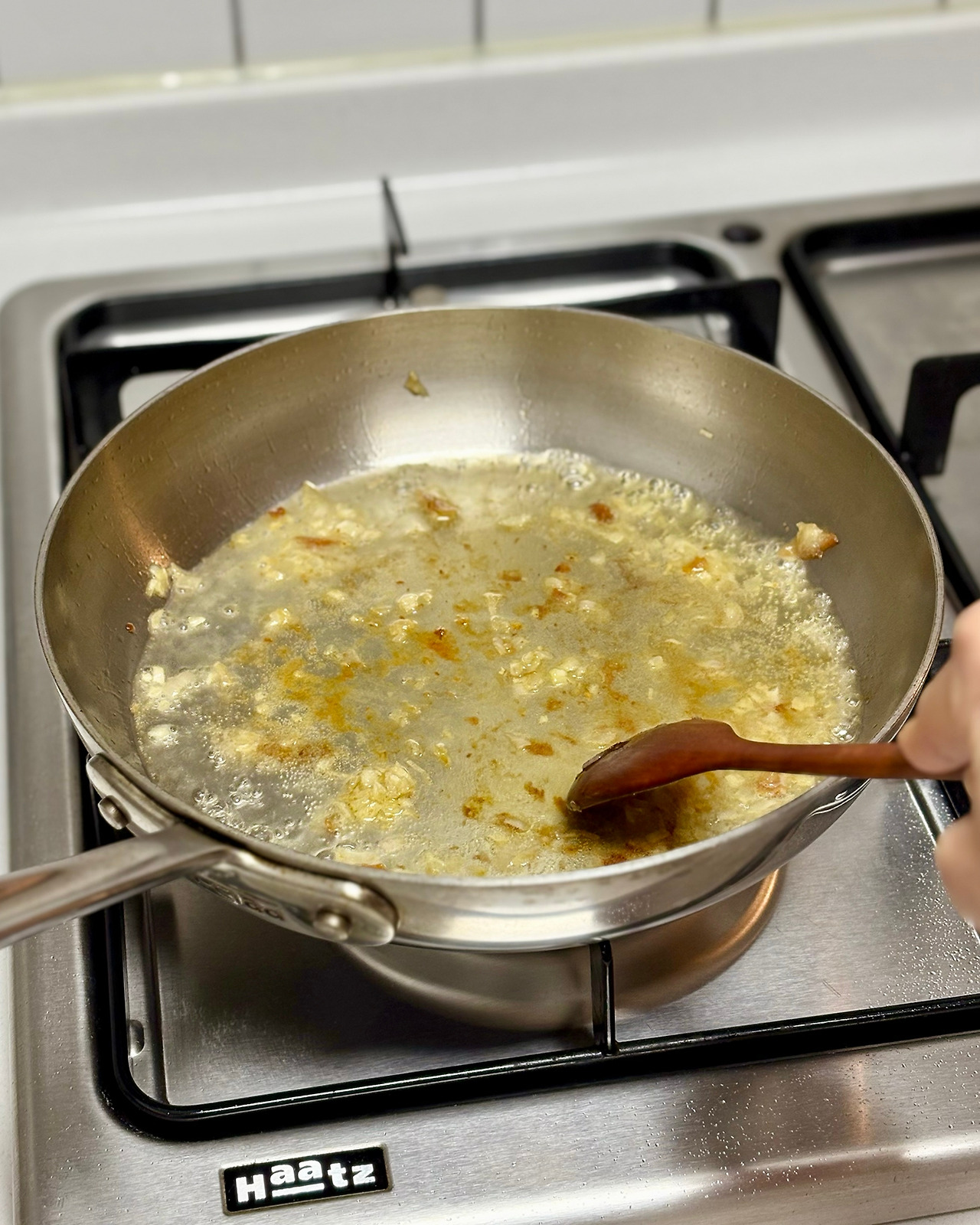 샬롯이 투명하게 볶아지면, 여기에 화이트 와인을 부어주세요. 불이 세면 와인이 순식간에 증발할 수 있기 때문에, 팬의 불을 끄고 와인을 부은 후, 팬이 조금 식으면 다시 불에 올려도 좋아요. 나무 주걱으로 팬에 붙은 suc를 모두 긁어서 화이트 와인과 함께 섞어주며 화이트 와인을 졸입니다.