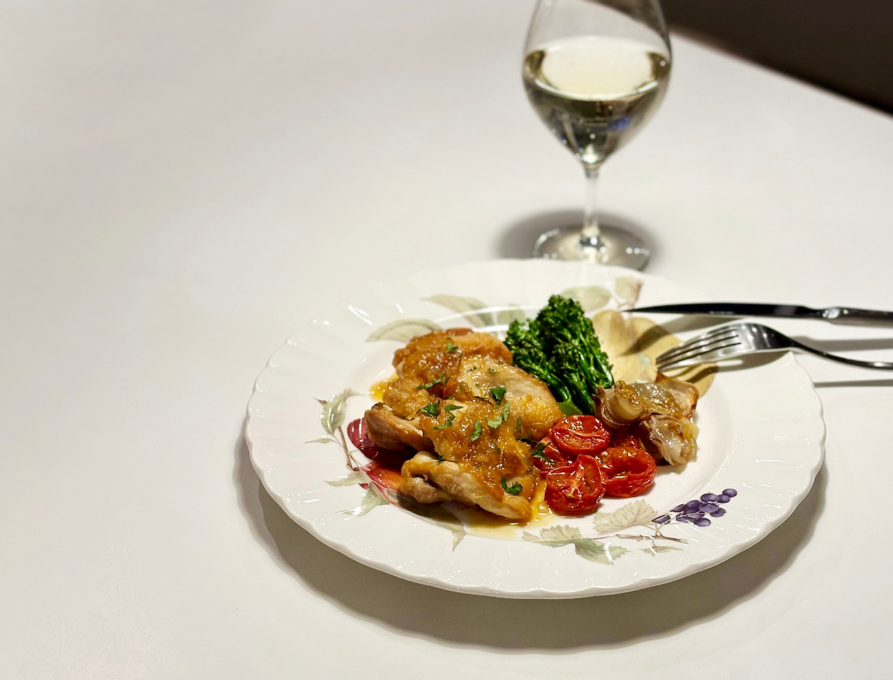 팬을 달구고 칙칙~ 소리가 나게 닭고기를 굽고, 팬소스를 만들기 위해 뜨거운 팬에 와인을 부으니 쉬~이익하는 소리와 함께 와인이 증발하면서 주방이 순간 뿌옇게 변했다. 난 고소한 닭고기 향기와 향긋한 와인향기에 벌써 신이 났다. 오븐에 아스파라거스와 양파를 구워 그릇에 닭고기와 함께 담았다. 요리사처럼 멋지게 숟가락으로 팬에서 소스를 떠서 닭 위에 샤~악 뿌려줬다.