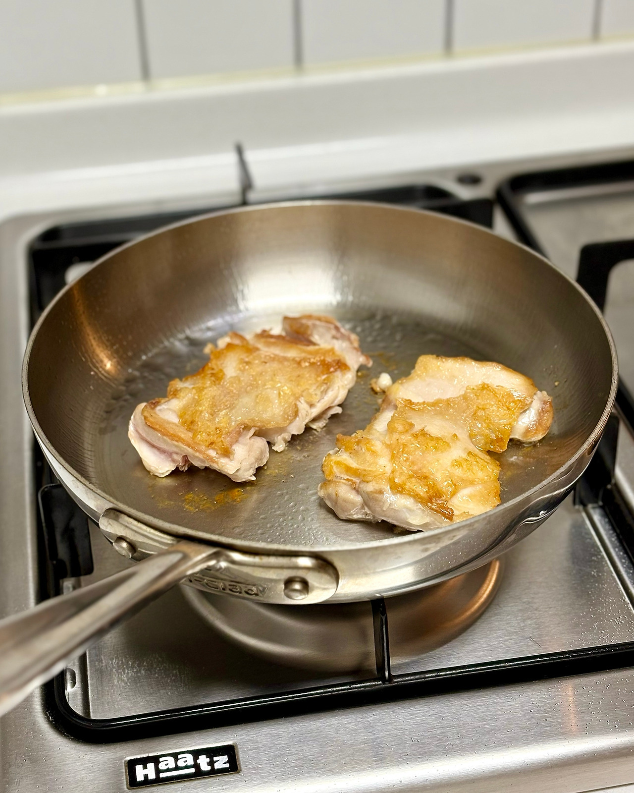 팬을 뜨겁게 달굽니다. 코팅이 안되어있는, 스테인리스 팬에 고기를 구울 때는 팬을 잘 달구는 것이 중요해요. 뜨겁게 달궈진 팬을 불을 끄고 조금 식혀주세요. 여기에 식용유를 키친타월로 얇게 발라주세요. 팬을 다시 불에 올린 후, 팬이 다시 충분히 달궈지면 닭고기를 올리세요. 닭고기는 껍질 쪽이 먼저 팬에 닿도록 하고, 팬에 올리기 전에 소금으로 간을 해야 합니다.