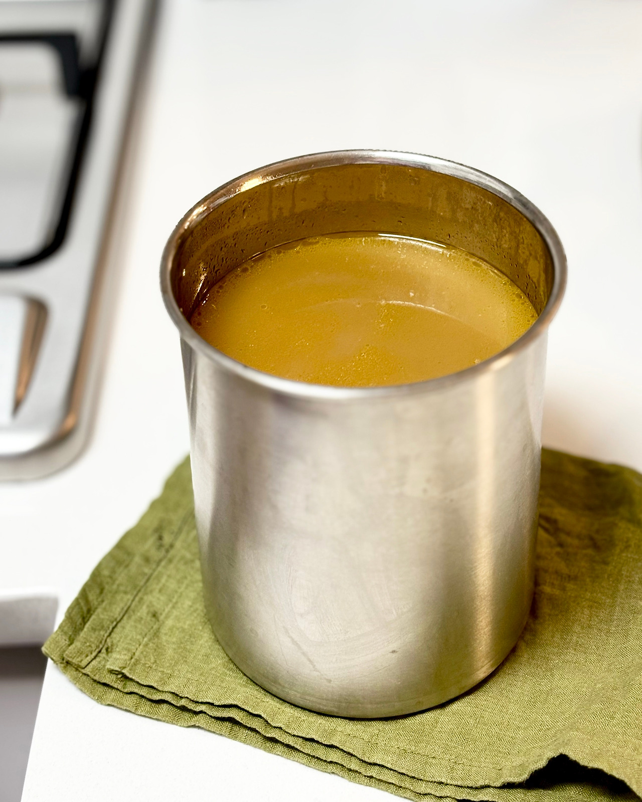 끓이는 시간이 비교적 짧고, 깨끗한 맛이 나는 맑은 치킨 스톡(white chicken stock, fond de volaille blanc). 여러모로 쓰임새가 다양하다. 수프와 같은 간단한 국물 요리를 만들 때도 사용하지만, 어떤 요리든 치킨 스톡을 조금 넣어주면 음식의 감칠맛을 끌어올릴 수 있다. MSG 같은 느낌이랄까? (맑은 스톡 레시피는 스톡, Stock - 01. 을 참고)