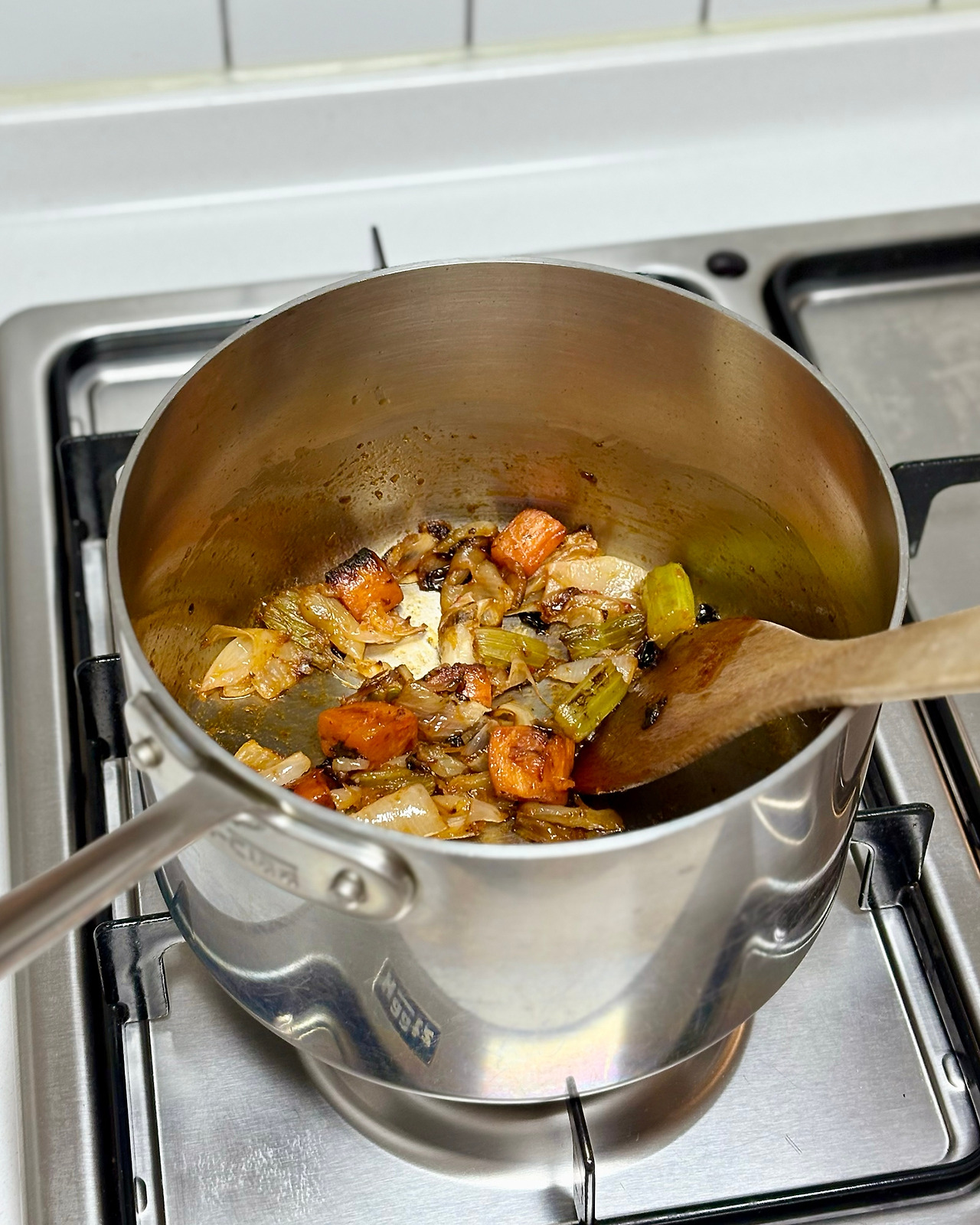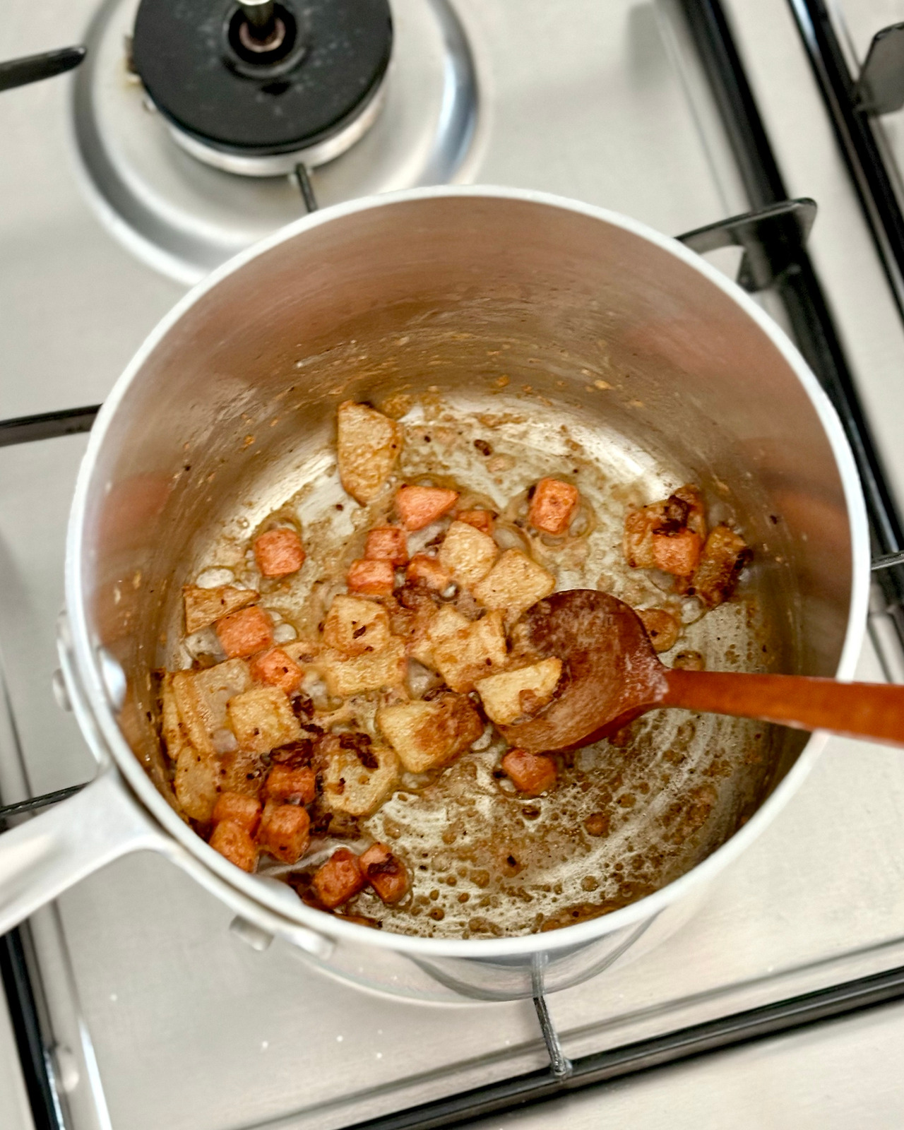 당근과 양파를 베이컨 기름에 노릇하게 익도록 볶아주세요. 버터를 당근/양파/베이컨과 섞고 그 위에 밀가루를 뿌려주세요. 낮은 온도에서 밀가루가 살짝 갈색 빛이 날 때까지 볶아줍니다. 살짝 갈색이 나게 볶아진 밀가루는 소스에 풍미를 더하고, 소스를 걸쭉하게 만들어 주는 역할도 해요. 잘 타는 토마토 페이스트는 불을 끄고 팬에 남아있는 잔열로 익혀주세요.