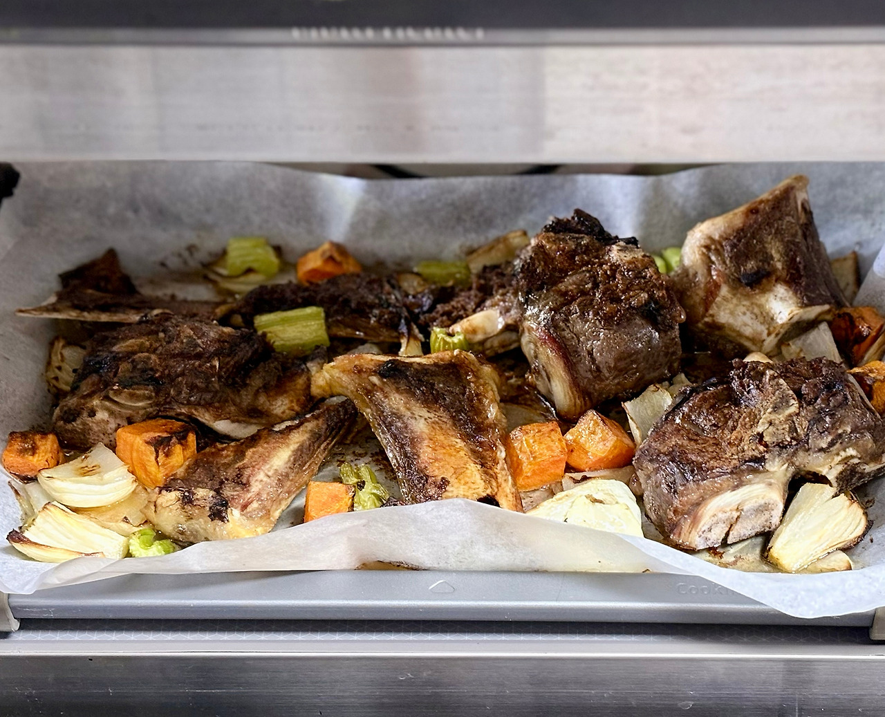 190~200도로 예열한 오븐에서 뼈와 채소를 함께 구워주세요. 타지 않고 진하게 노릇한 색이 나올 때까지 구워주는데요, 보통 40분 정도 걸려요. 중간에 뼈와 채소를 뒤집어 전체적으로 노릇하게 구워지도록 해주세요. 재료가 타버리면 스톡에서 쓴맛이 나고, 충분히 노릇하게 구워지지 않으면 진한 스톡의 맛이 나질 않기 때문에, 이 과정이 정말 중요해요! (혹시 채소가 먼저 노릇하게 구워지면, 채소는 빼내고 뼈만 더 구워주세요.)