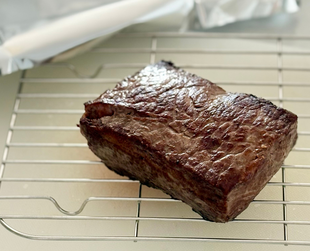 마이야르 반응이 잘 일어나 맛있게 익은 스테이크는 팬에서 꺼내 식힘망에 올리고, 쿠킹포일로 느슨하게 덮어 둔 상태로 5-7분 정도 휴지(=레스팅)시키세요. 고기를 구울 때, 열에 의해 고기의 겉면이 수축하면서 육즙이 모두 가운데로 몰리게 되는데, 고기를 휴지 시키면 겉면이 조금 식으면서 수축된 고기의 조직이 풀려 육질이 부드러워지고, 육즙이 고기 전체에 골고루 퍼져서 고기가 촉촉해져요.