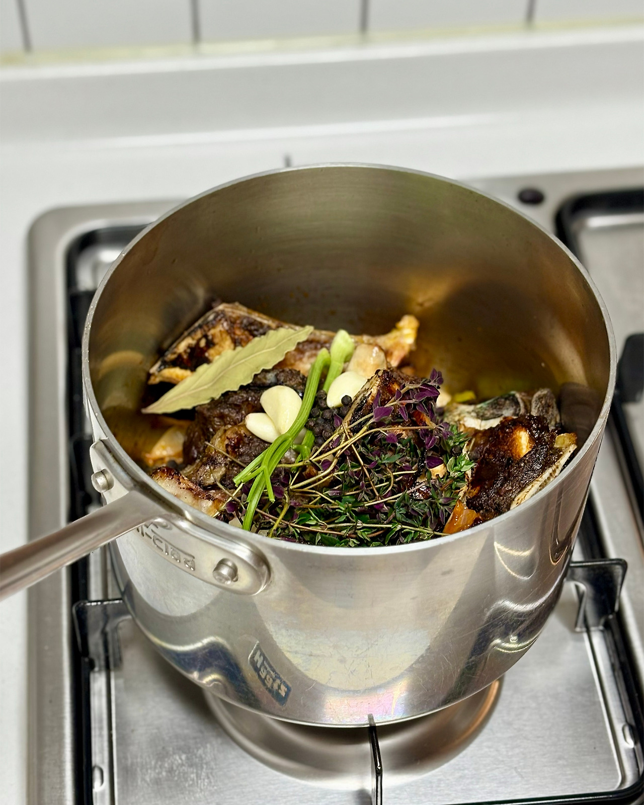 그 위에 구운 소뼈를 올리고, 타임, 마늘, 월계수 잎, 통후추를 넣고 찬 물을 가득 붓습니다. 처음에는 센 불에서 물이 끓도록 하고, 물이 끓기 시작하면, 불을 약하게 줄여 보글보글 끓도록 합니다. 이제는 스톡을 끓이기만 하면 되니 간단해 보이지만, 스톡을 끓이는 이 시간도 정말 중요해요. 스톡이 너무 바글바글 끓거나, 위로 뜨는 불순물을 그때그때 제거해 주지 않으면 스톡이 탁해지고 텁텁한 맛이 나요. 불을 중간보다 약한 불로 유지하며, 처음 두세 시간은 적어도 20~30분에 한 번씩 열심히 스톡 위로 떠오르는 기름과 불순물을 제거해 주세요.