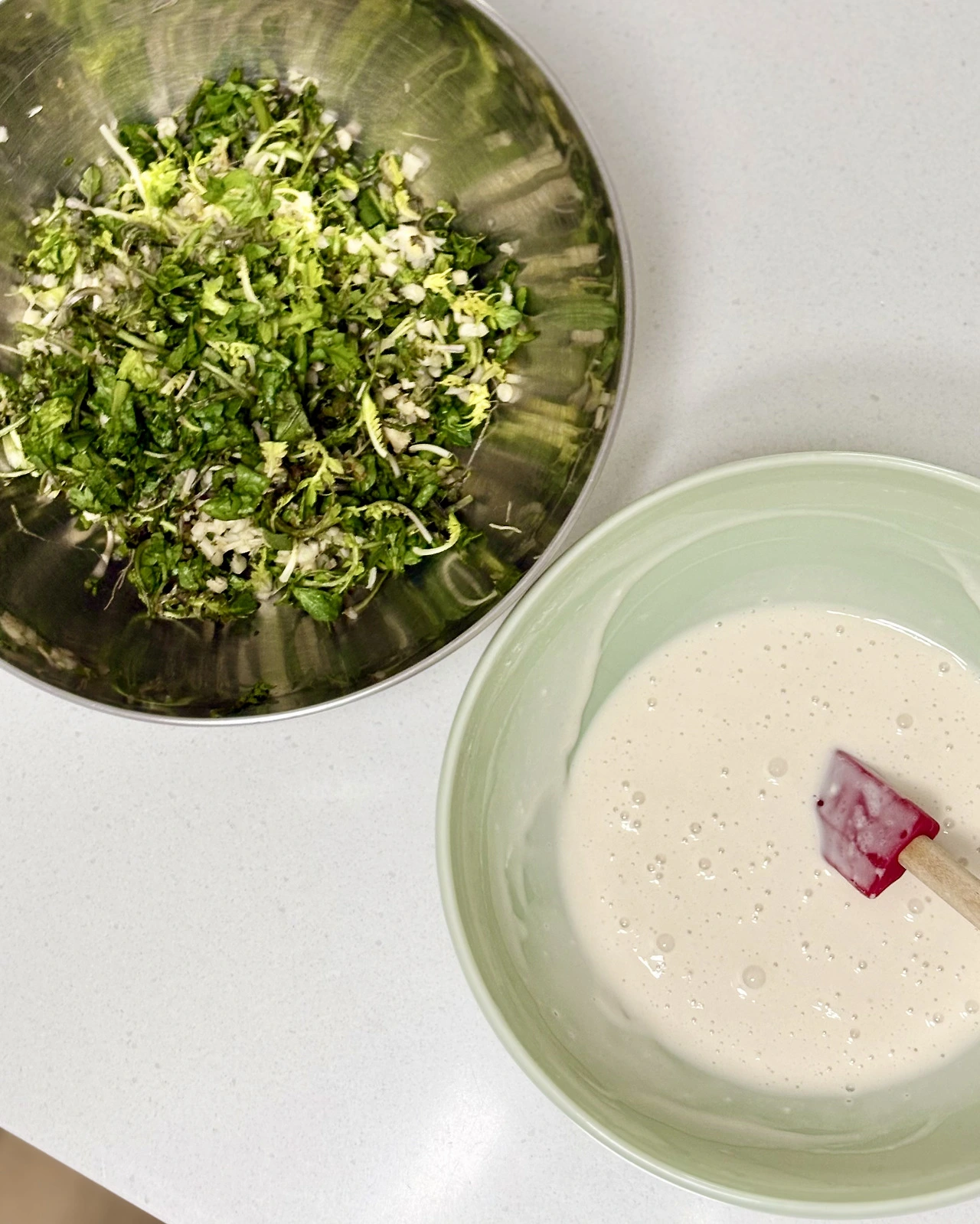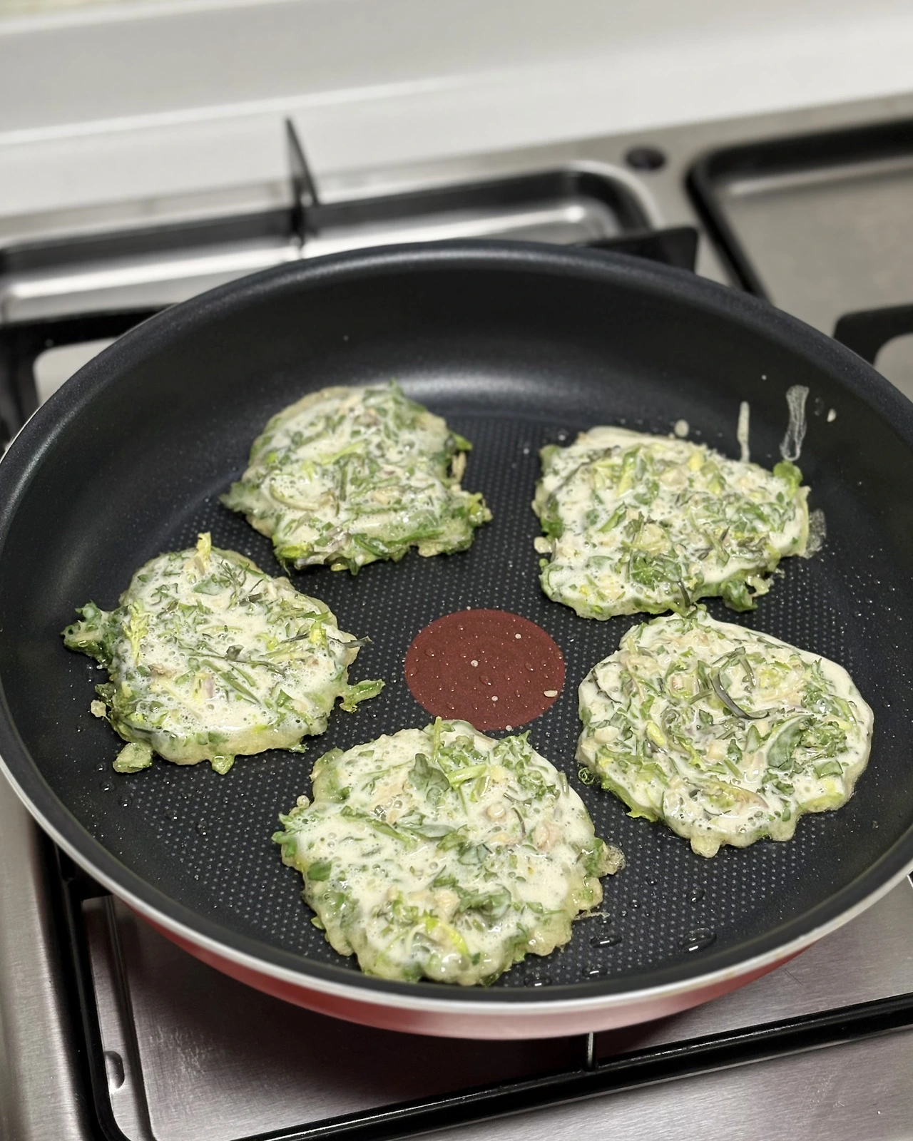 냉이도 깨끗이 씻어 손질해 주세요. 냉이가 은근히 손질하는데 시간이 좀 많이 가요. 손질한 냉이는 반죽과 섞일만한 적당한 크기로 썰어주세요. 이제 부침 반죽을 만들어 볼 거예요. 우선 밀가루, 녹말가루, 베이킹파우더, 소금을 잘 섞은 후, 물을 붓고 가루 몽우리가 없도록 잘 저어 반죽을 만들어주세요. (부침가루가 있으시면 부침가루를 쓰시면 됩니다.) 부침 반죽을 냉이에 붓고 냉이와 잘 섞어주세요. 중간 불에 달궈진 프라이팬에 식용유를 충분히 두르고 냉이전 반죽을 한 숟가락씩 떠서 작고 예쁘게, 앞뒤로 노릇노릇하게 부쳐줍니다. (홍고추로 장식을 할 때에는, 홍고추를 얇게 동그랗게 잘라 하나씩 위에 올린 후, 전을 부쳐주세요.) 자~ 노릇노릇 맛있게 부친 냉이전도 달래장에 찍어 드시면 좋겠죠?