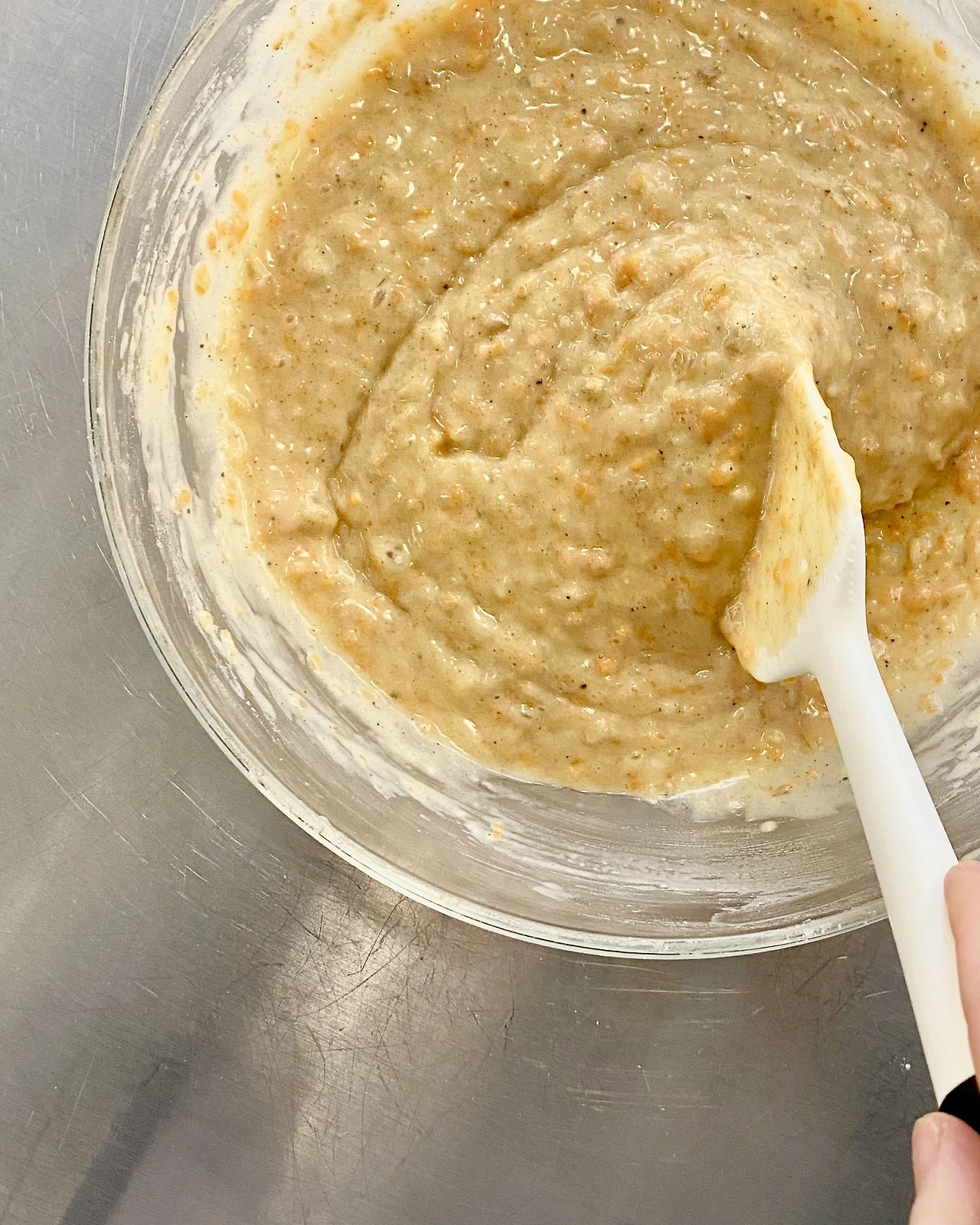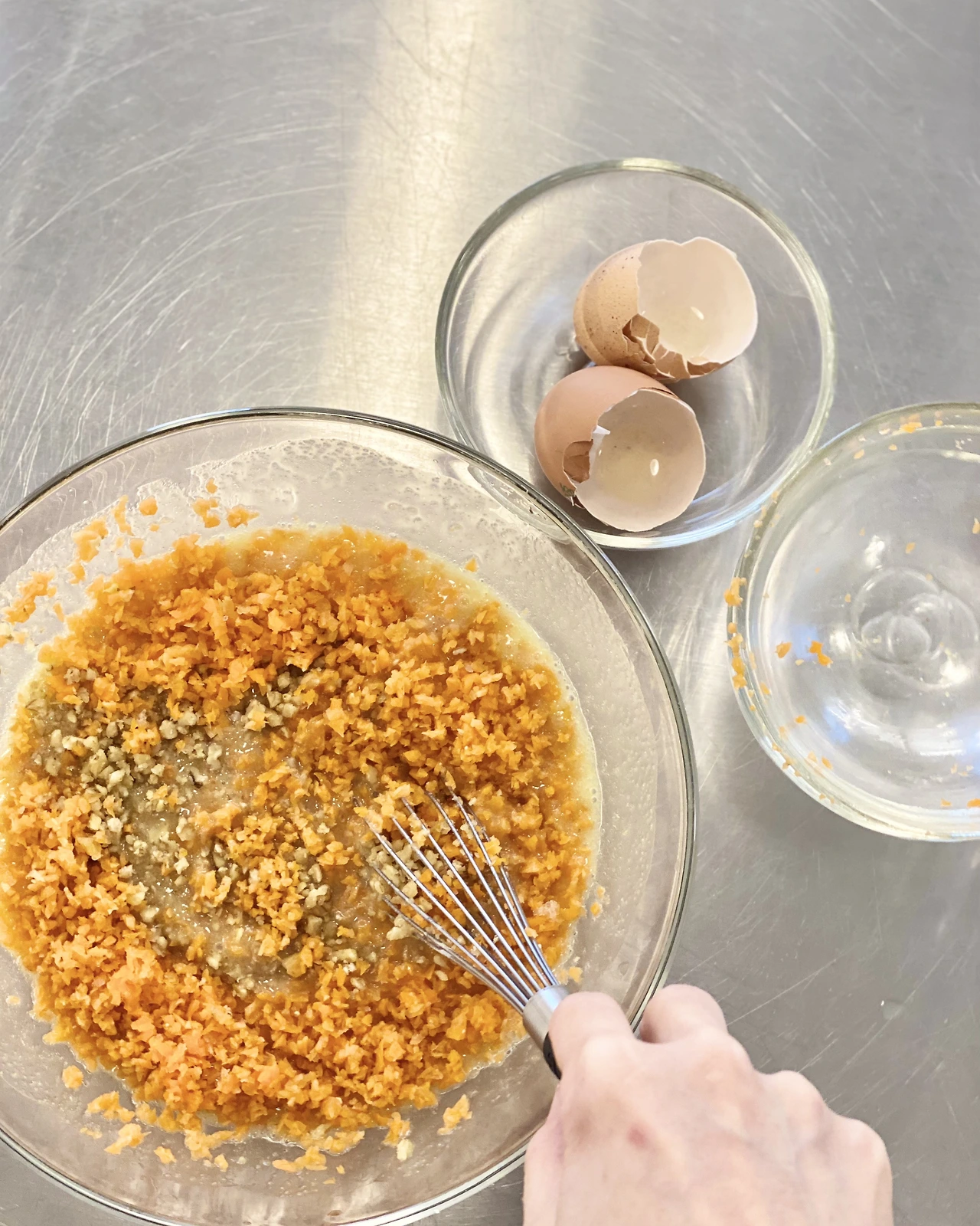 당근 케이크 재료 밑의 '마른 재료 dry ingredients'를 우선 섞도록 합니다. 중력분에 베이킹소다, 계핏가루, 넛맥 간 것, 소금, 옵션으로 적어 놓은 클로브나 올스파이스 가루를 잘 섞어주세요. 이제 '젖은 재료 wet ingredients'를 섞습니다. 식용유에 옅은 갈색 설탕과 달걀을 넣고, 거품기로 충분히 그리고 빠르게 저어 기름이 달걀과 분리되지 않도록 합니다. 여기에 잘게 자른 당근과 호두를 넣어 섞습니다. 마지막으로 젖은 재료 섞어 놓은 것에 마른 재료 섞어 놓은 것을 조금씩 부어가며 저어주세요. 밀가루의 흔적이 없을 때까지만 살살 섞습니다.