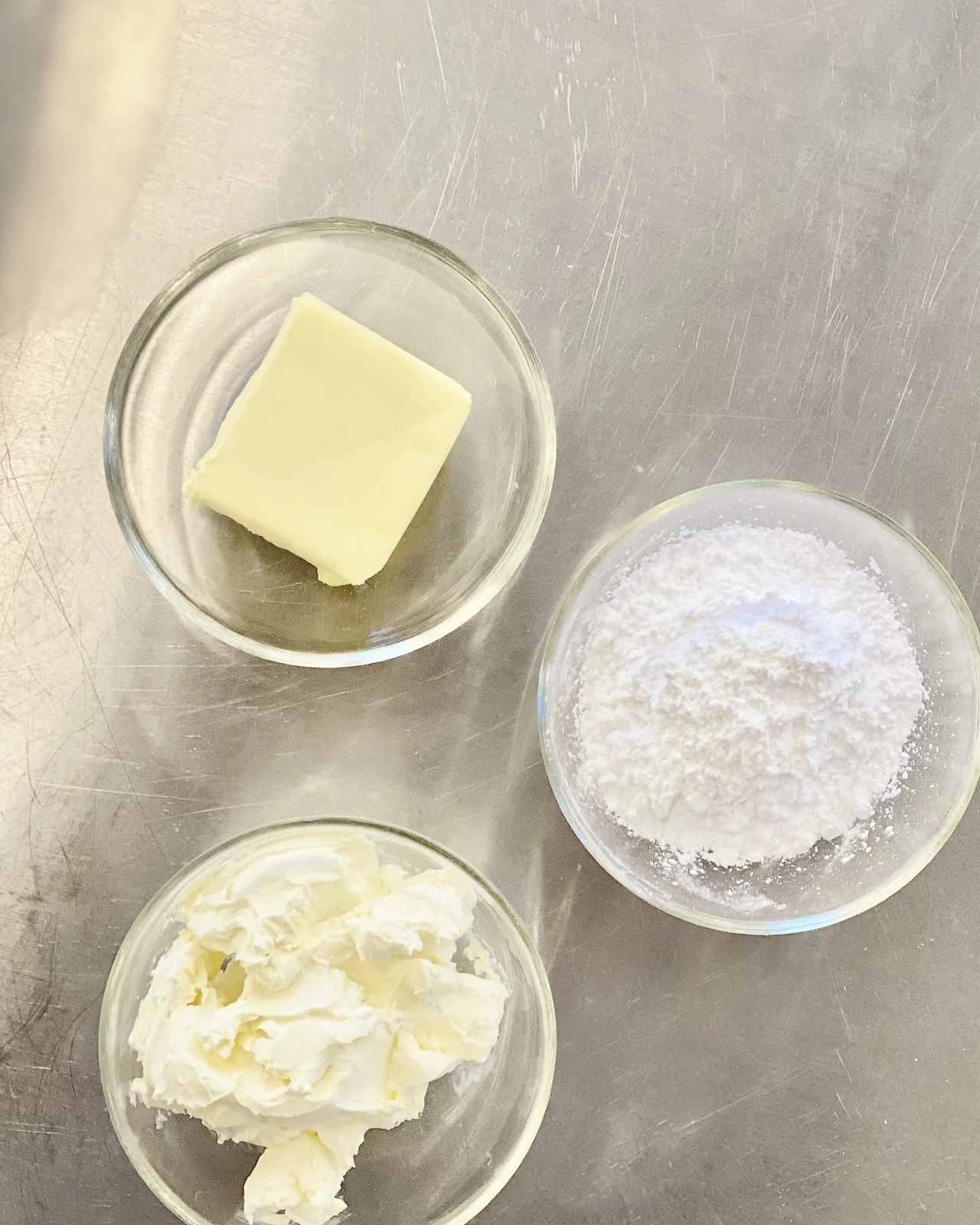 케이크가 식는 동안 크림치즈 아이싱을 만듭니다. 크림치즈와 버터는 차가운 것을 바로 쓰지 마시고, 상온에 30분 이상 놓아두어 살짝 부드러워진 것을 사용하시면 좋아요. 크림치즈와 버터를 우선 핸드 믹서기로 잘 섞어 부드럽게 만든 후, 슈가파우더를 조금씩 넣어가며 섞어주세요.