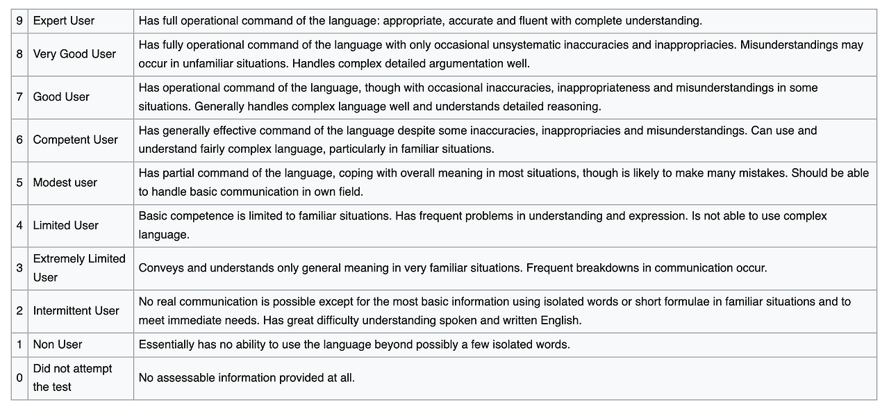 7.0은 Good User로 실무에서 사용 가능한 언어 구사 능력이 있고, 가끔 특별한 상황에서는 정확도나 적절성, 이해를 잘못하는 부분이 있을 수 있다. 대체적으로는 심층적인 언어를 다룰 수 있으며, 디테일한 논리에 대한 이해가 가능하다.