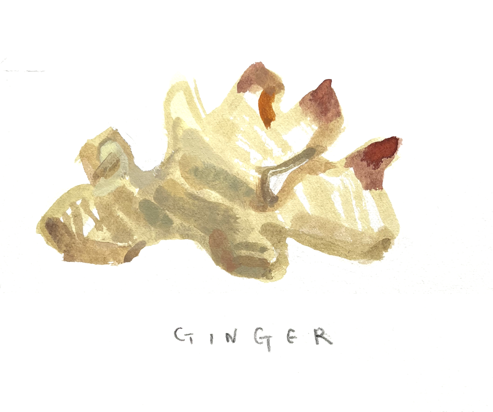 한국에서 생강은 서리가 내린 후 수확이 시작된다. 겨울이 오기 전 재래시장에 가면 금덩이처럼 땅에서 캐낸 토실토실한 햇생강을 만날 수 있다. 갓 수확한 생강은 전년에 수확한 저장생강보다 매운맛은 덜하나, 육질이 연하고 레몬과 유사한 상큼한 풍미*의 청량감이 일품이다. 가끔 직접 재배한 생강을 파는 손이 두툼한 농부를 만나면 장보기 성공한 날! 이유인즉슨 줄기째 뽑아온 생강을 구매할 수 있는 터이다. 뿌리로부터 연결되는 고운 비단 같은 영롱한 자줏빛 줄기 부분은 뿌리와 맛이 비슷하나 가벼운 풀 내음이 더 나고 수분이 많아 짜이에 넣으면 맛이 경쾌해진다.