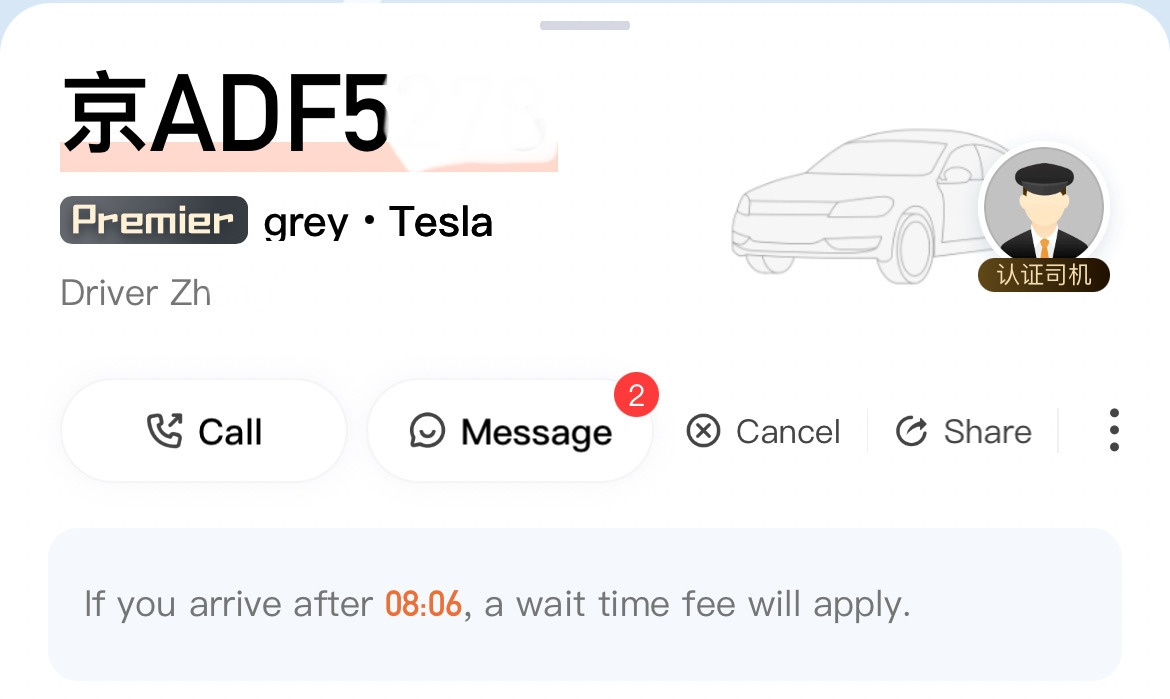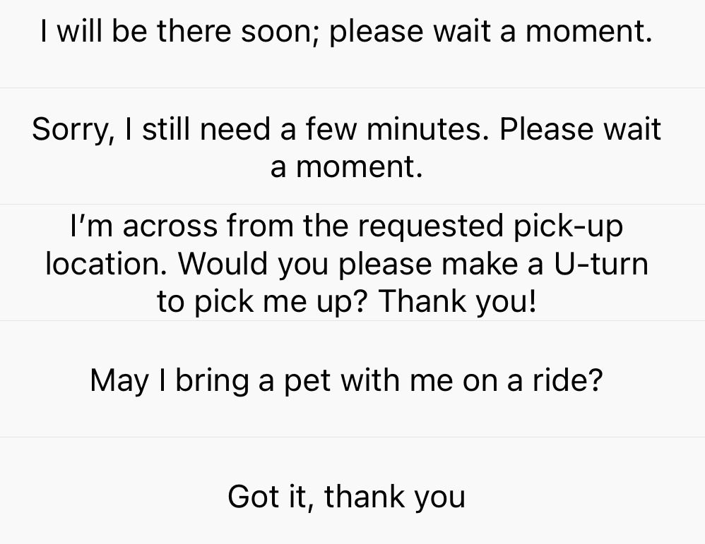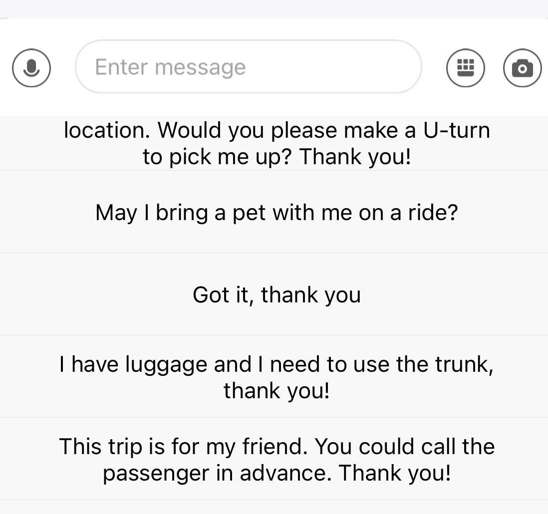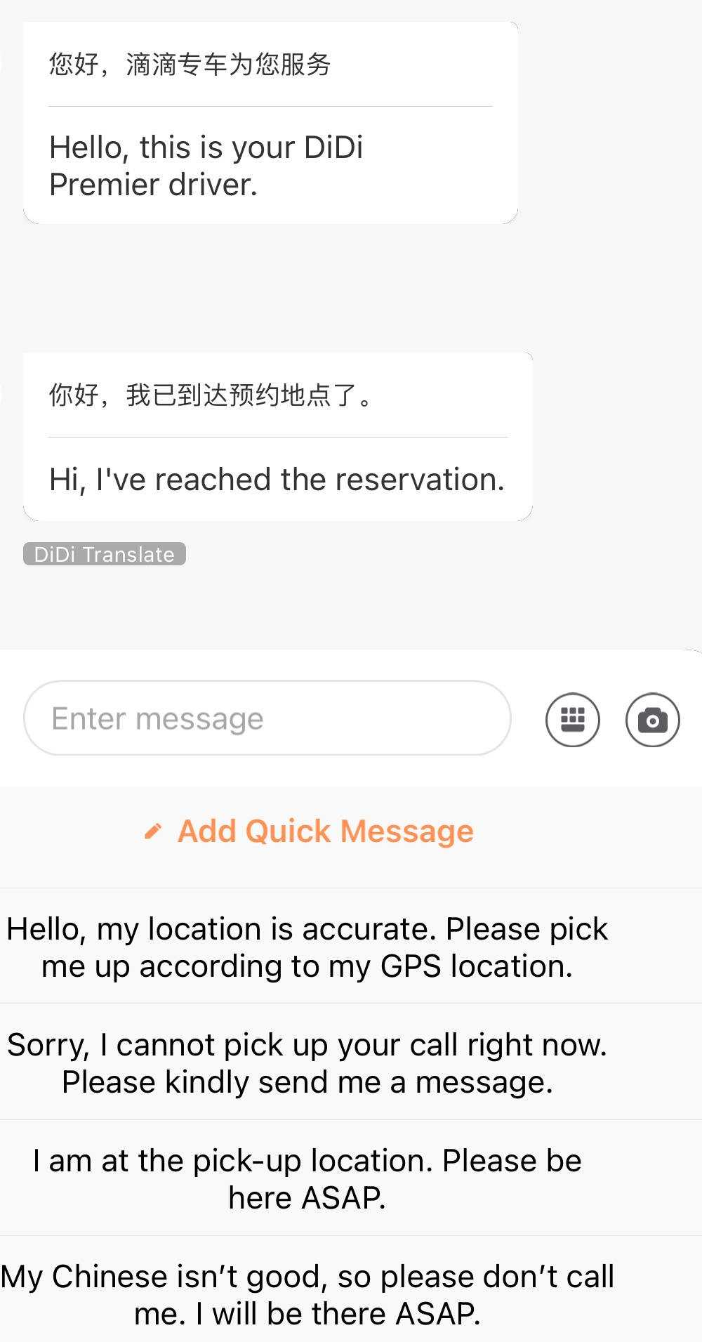 중국어뿐 아니라 영문 버전으로 언어 설정도 가능하고, 기사분한테 택시 타기 전에 내가 할 수 있는 메시지가 내장되어 있어서, 쉽게 메시지도 전송이 가능하다. "금방 가요, 조금만 기다려주세요." "저는 중국어 못하니, 전화하지 마세요." "조금 시간이 더 필요해요." 등 꽤 쓸만한 문장들이 영어로 쓰여있어서 그걸 전송하면, 기사도 자신이 누르는 중국어 메시지가 영문으로 내게 보인다.
