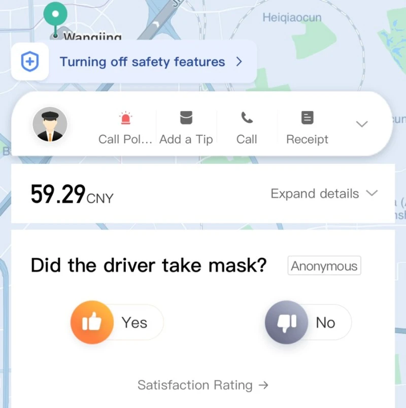 택시를 부르면 택시 기사의 이름, 차량, 운전 경력 연수, 차종, 차량 색깔, 넘버가 뜨고, 이용 후에는 기사의 서비스를 평가하기도 하고, 코로나 때는 마스크를 썼는지의 유무도 대답할 수 있었다. (요새는 주의 깊게 보지 않아서 모름.) 중간에 위험한 일이 생기면 신고를 할 수 있는 Call Police 버튼도 있고, 외국인이 Didi 택시를 이용하기에 아주 편리하다.