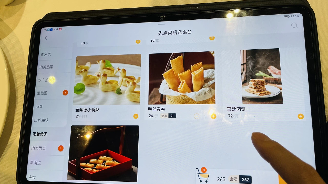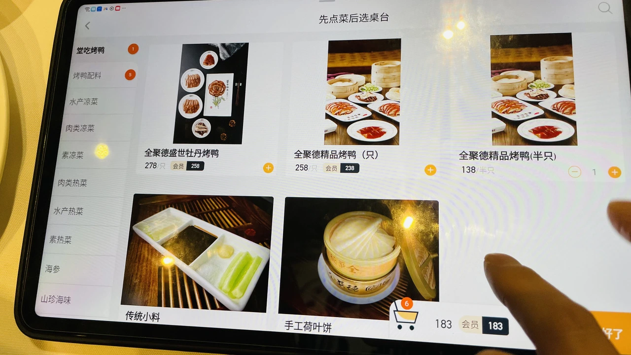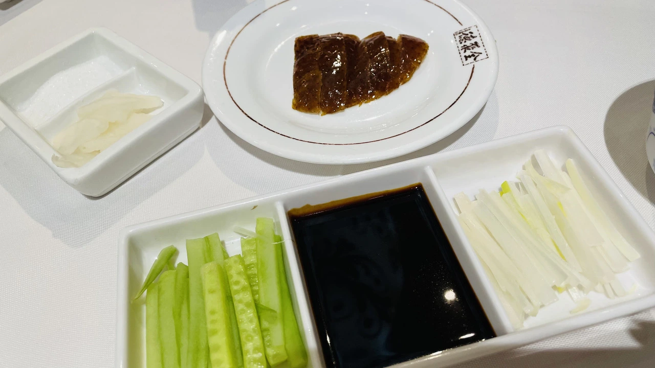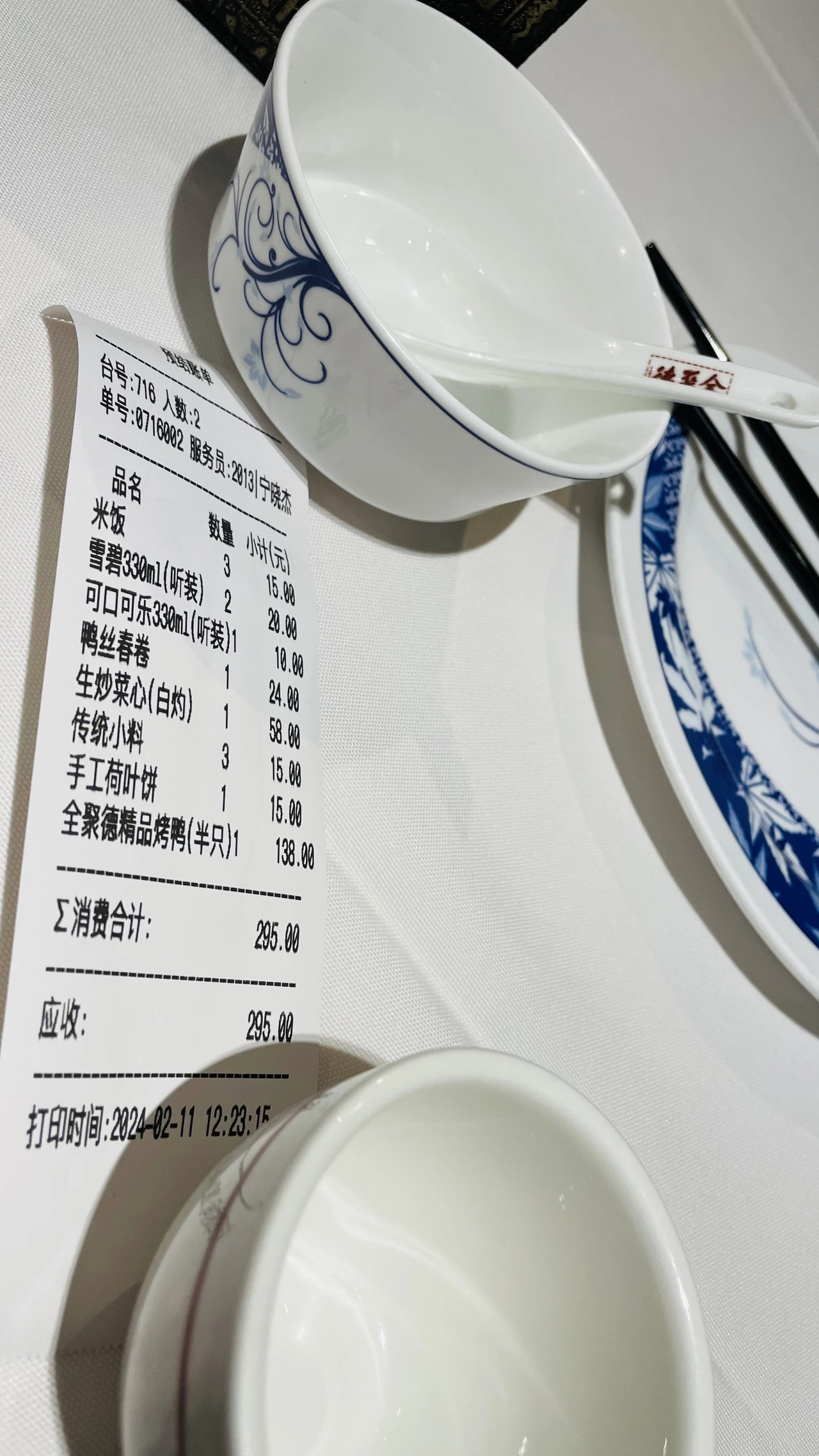 자리에 앉아서 세트 메뉴판을 스캔해서 번역기를 보고 있는데, 직원이 친절하게도 우리가 보고 있는 페이지는 양이 많다고 뒤쪽의 메뉴를 추천해 주셨다. 남편은 식탁 위의 아이패드로 사진을 보며 주문을 하기 시작했고, 카오야를 좋아해서 온 게 아니라 맛을 다시 보자고 방문한 거라서, 카오야 반 마리, 춘권, 야채 볶음, 밀전병 2개, 소스 세트 3개, 밥 3개, 음료수 3캔을 주문했다. 우리가 총 주문한 가격은 310 rmb로 한화 약 57,500원 정도였다.