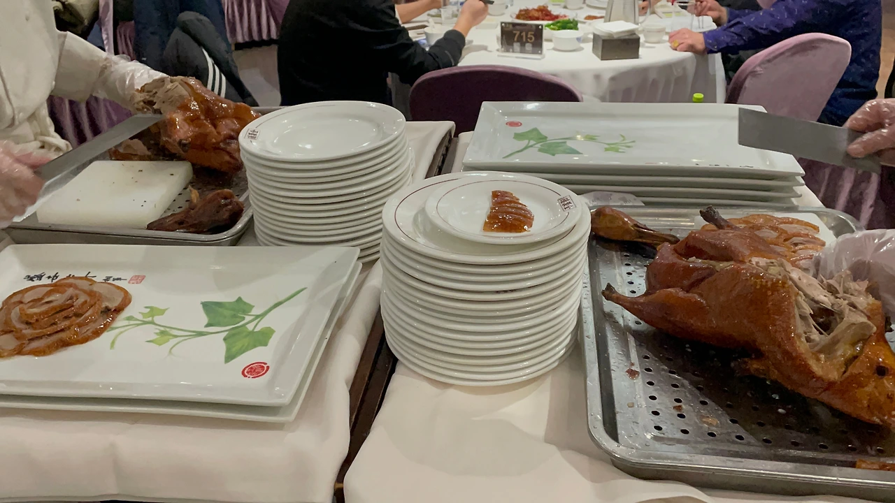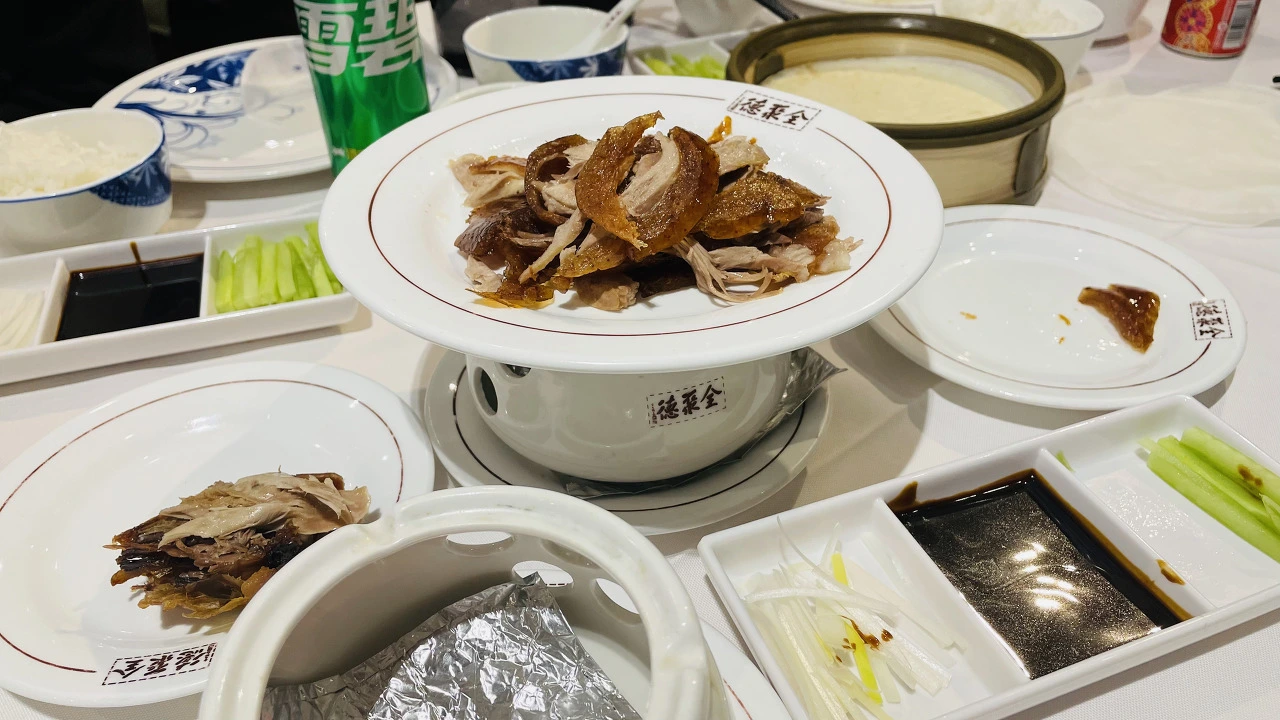 그래도 춘절 연휴인 거에 비해서 대기 없이 빈 테이블에 앉을 수 있었는데, 식당 내부의 느낌은 오래된 결혼식장의 뷔페식당 같은 느낌이었고, 테이블 주변에서 기름기가 쫙 빠진 오리를 사시미 뜨듯 뜨고 계신 요리사 아저씨들의 분주한 손도 볼 수 있었다. 한쪽에 '나는 오리였어요.' 하듯이 오리의 얼굴이 있다.