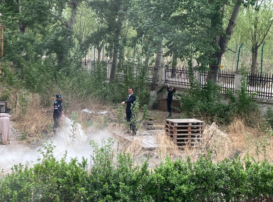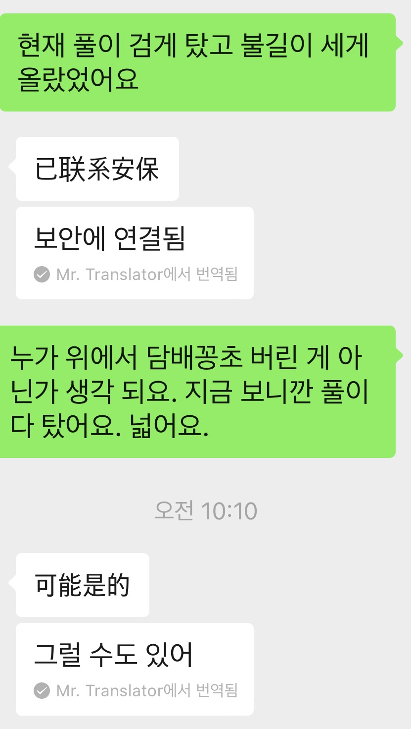 생각보다 면적이 컸고, 관리실 직원들과 일꾼들도 하나둘 모이기 시작하고 6-7명 정도가 일을 처리하기 시작했다. 서둘러 소화기를 난사하고, 갑작스러운 흰 연기가 바람과 함께 불어와서 놀래서 뒷걸음질 치며, 내가 본 큰 불을 설명할 수가 없어 답답했다. 옆에서 상황을 주시하며 중국말 못 하는 동양인 여자가 핸드폰 번역기를 켜서 보여줄 수 있는 말을 최대한으로 전달했다. 소화기에 이어 물호스가 등장하여 위를 또 뿌리고, 담배꽁초를 버린듯한 위치를 계속 물색하며 사진을 찍고 이들에게도 비상 상황이어 보였다.