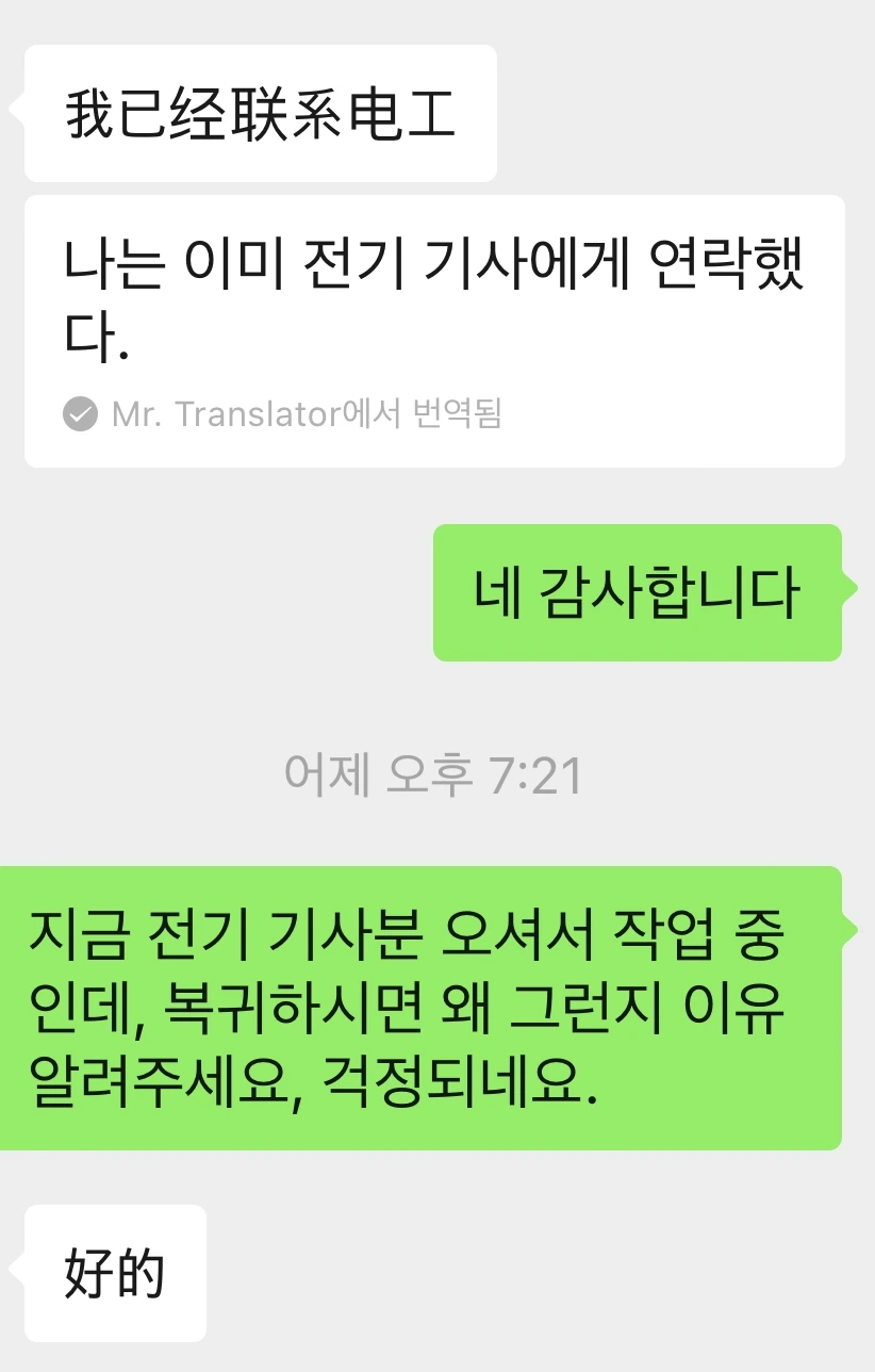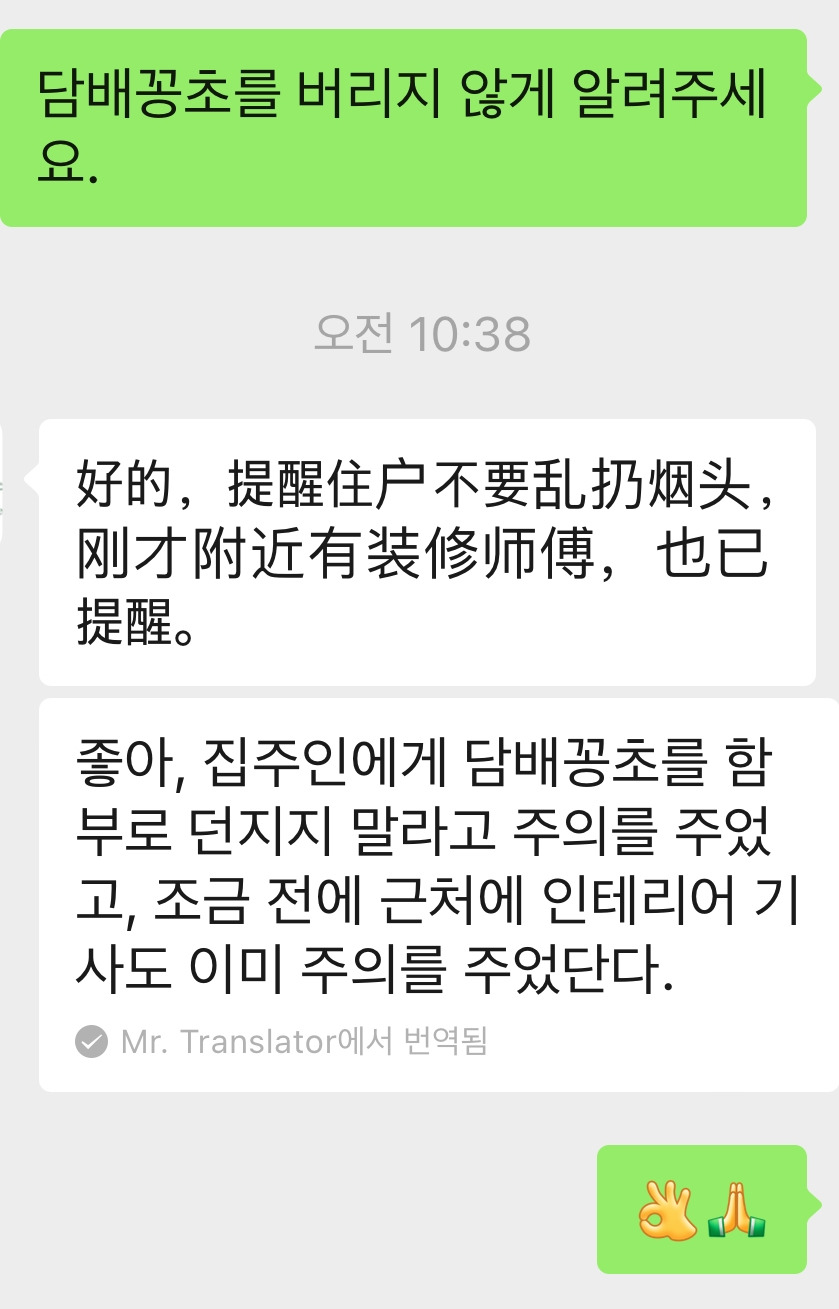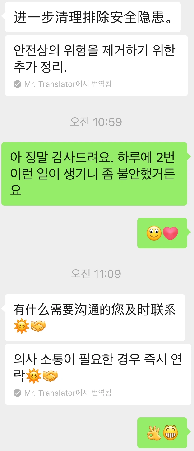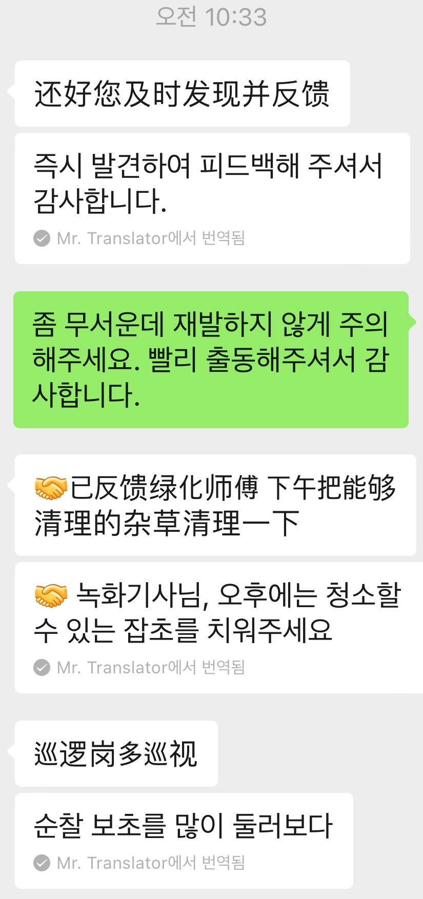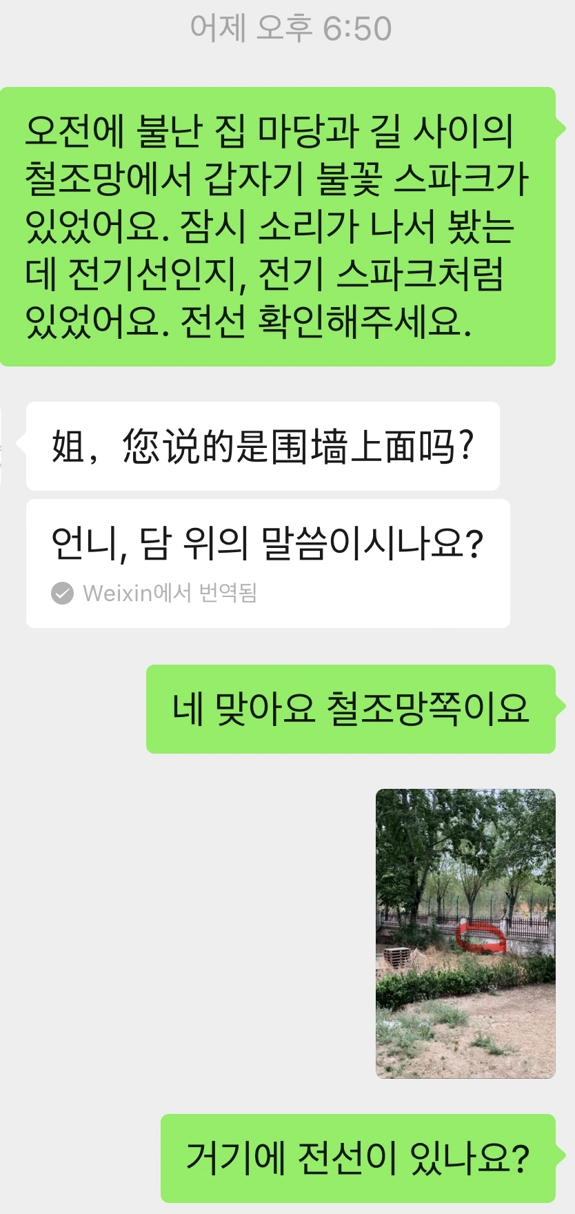 다음 날 아침에도 이어지는 화재 현장의 잡초 제거 및 전선 쪽에도 복구 작업을 하는 듯해 보였는데, 먼저 관리소 측으로부터 위챗으로 메시지가 도착했다. 작업자들이 화재 현장의 잡초를 제거하는 모습, 정리가 끝나서 불룩한 쓰레기 봉지들 사진, 그리고 전선을 아예 떼어버리는 제거 작업들의 현정 사진과 함께 메시지를 전달해 주었다. 안전상의 위험을 제거하기 위해서 추가 정리 중이고, 의사소통이 필요하면 즉시 연락하라고 말이다.