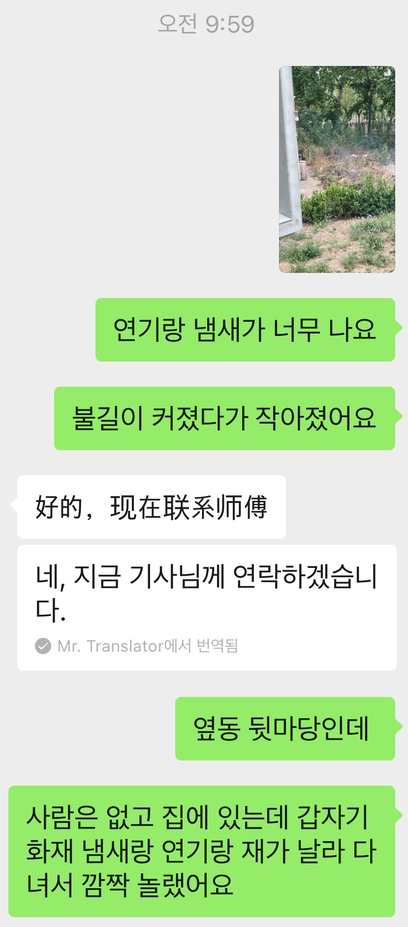 "뭐야!! 저건 불이다! 불이 났다!!" 무서운 시뻘건 불이 활활 타오르고 뒷마당의 마른풀들이 무섭게 불어대는 강풍과 함께 검게 타오르고 있었다. 순간 마당에서 누가 쓰레기를 태우나 싶어 둘러봤지만, 사람은 보이지 않았다. 불이 나면 119인데, 이곳은 뭐지? 중국 전화에 한국 전화, 총 2개의 전화기를 쓰고 있기에 얼른 중국 전화기를 찾기에 급급했다. "어딨 지??" 고민할 새도 없이 내 손은 이미 핸드폰의 관리실 단톡방에 관리자를 찾아 위챗을 보내고 있었다.