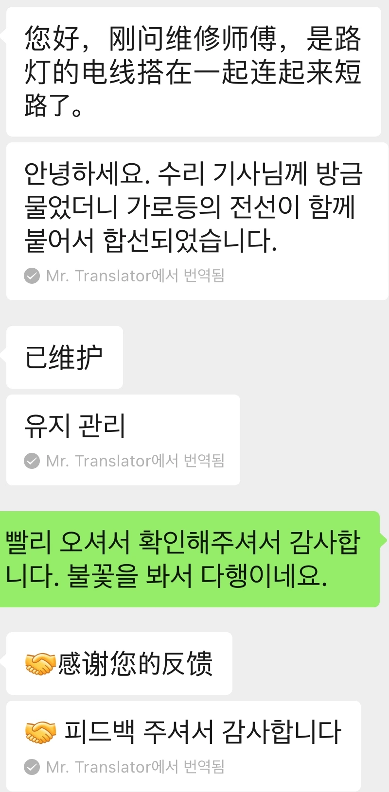 하루에 2번이나 사건을 목격하니 조금 불안해지기 시작했다. 관리소에 연락하여 전기 작업자 아저씨들이 복귀하면 어떤 원인이었는지 알려달라고 했는데, 이유는 가로등의 전선이 어떠한 이유로 합선이 되어서 불꽃 스파크를 냈었나 보다. 어두컴컴함 속에서 한 명은 플래시를 비치고, 다른 작업자는 수리 보수를 하는 듯하고 그날 저녁의 해프닝들은 그렇게 마무리가 되었다.