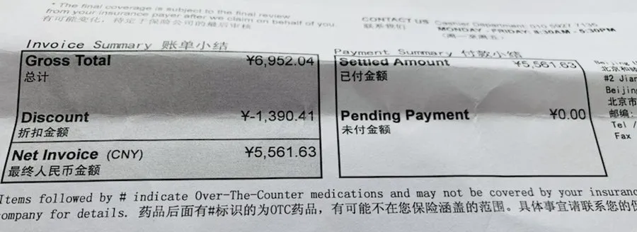 중국에서 주재원 가족으로 살면서, 두 번 겪기 힘든 전염병을 겪다 보니 마음의 불안이 신체화 증상으로 나타났고, 거기에 심장의 기운을 주는 처방으로 내 상태는 말이 아니었지만, 결국은 간단한 피검사, 혈압검사, 심전도를 하고 3시간 누워있다가 총금액 6,952 RMB(약 140만 원)에서 할인을 받아, 5,561.63 RMB(약 112만 원)을 결제하고 나오고야 말았다.