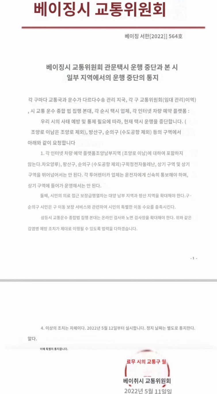 당시에는 남편이 출장을 가도 그쪽 지역이 통제되어 버리면 몇 달을 집에 돌아오지 못하거나, 베이징에서 타 도시에서의 이동을 막아서 코로나 세탁을 위해서 청정 지역을 찾아서 2주를 머무르고 오기도 했다. 출장을 가자마자 그 지역이 봉쇄가 되어서 매일 같이 목이 헐도록 코로나 검사를 하고, 전날 맥도널드를 시켜 먹었는데 배송기사가 양성이 나와서 갑자기 호텔 측에서 방에서 나오지 말라고 방문에 센스를 붙이기도 했다.