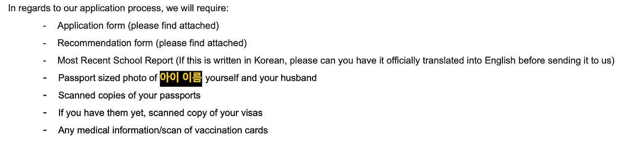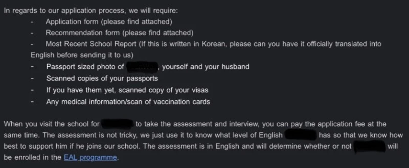 모든 서류를 준비하고, 한국 초등학교의 담임 선생님한테 추천서 받고, 인터뷰보고, 최종 합격 통보까지 2개월 반 안에 모든 걸 끝내야 했다. 학교의 종류도 미국계, 영국계, 캐나다계, 한국 국제학교, 로컬 등 종류는 너무 다양해서 일일이 어떤 학교인지 파악하는데도 너무 오래 걸렸다. 또 아이가 EAL(English as an additional Language)을 들어야 할지에 따라서 TO가 달라지기도 했다.