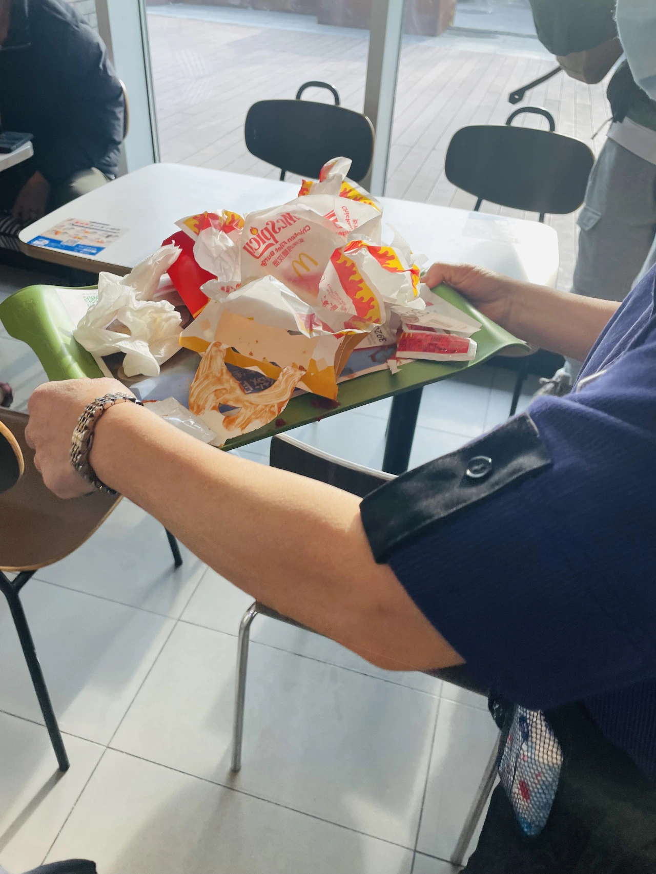 우리가 먹고 난 트레이와 쓰레기들은 직원이 버려준다. 음료수 컵까지 있으니 두 번에 나누어 버려 준다.