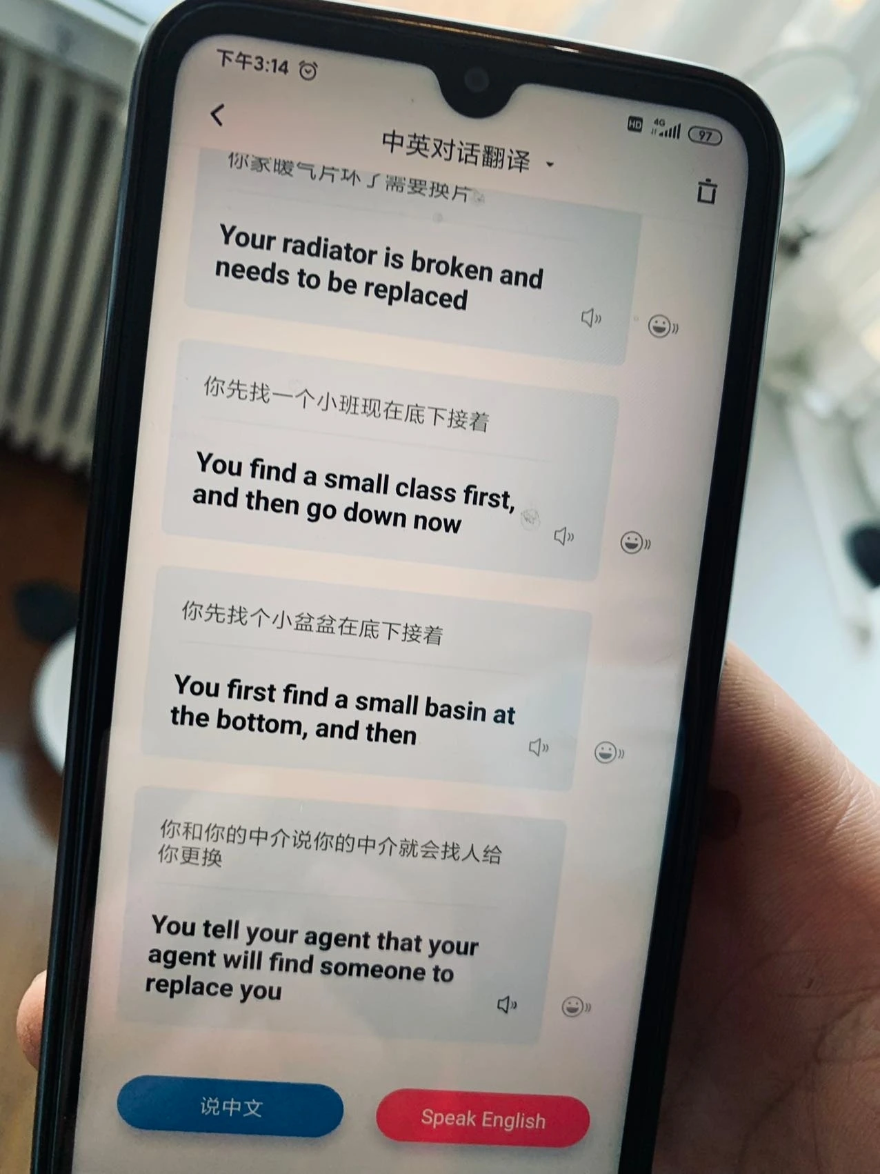 아,,, 늘 작업자와의 의사소통은 고통의 시간이다. 서로 벙어리가 된 채, 중국인 작업자 아저씨도 중국어로 말하다가 도무지 눈만 껌뻑이는 이 한국인에게 번역기를 사용하여 대화를 시도해 본다. 중국인 부동산과 초보 영어 수준이지만, 영어로 이야기를 하니 아저씨는 영어로 번역기를 켜준다. '한국인입니다만, 중국어보다는 낫네요. 그래도 감사합니다.'