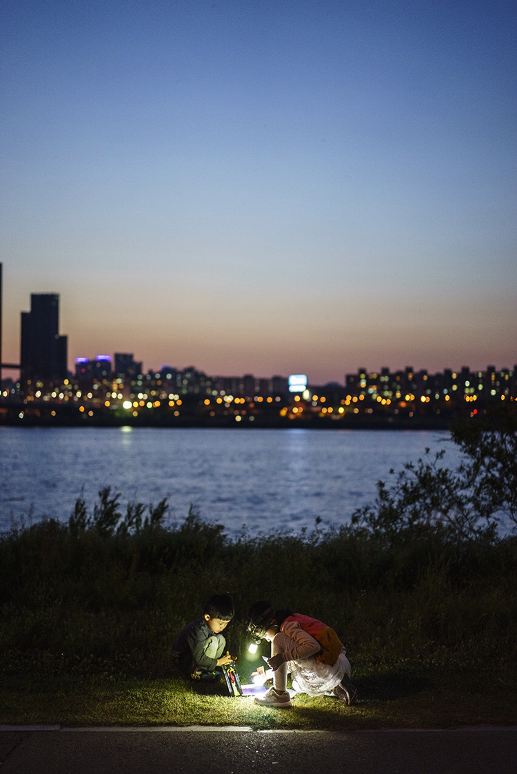 여름날,어스름 해질녘강변에 나들이 간남매가 불을 밝힌다..반딧불이라도 찾으려는 걸까?아이들의 호기심은잿빛 도시에서도반짝반짝 빛난다..어둠을 몰아내는희미한 꼬마등불처럼작고 미약하지만어른들이 망각한 동심처럼 소중하다.