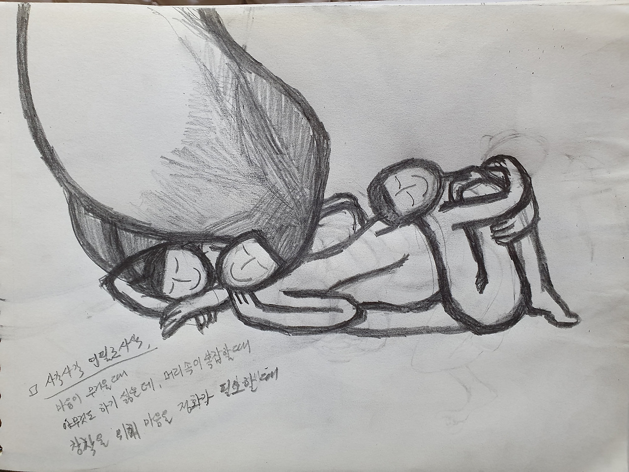 방대하고 자신감 넘치는 폭풍우 같은 드로잉을 마주할 때마다 드로잉 앞에 잔뜩 겁을 먹은 내 모습을 떠올리기도 해요. 한 것 거침없는 자유로움, 자신감 있는 선과 감각들 그 기운에 제압당하는 꼴이란 영락없이 무언가에 쫓기거나, 끌려 다니는 예술가의 삶이 여실히 드러나요. 도화지 안에 주인이 되지 못해서죠. 아이가 눈밭에서 거침없이 둥구르는 것처럼, 농부가 논밭에서 망설임 없이 수확을 하는 것처럼 작가는 종이 위에서 두려움이 없이 뛰 놀듯 그려야 해요.