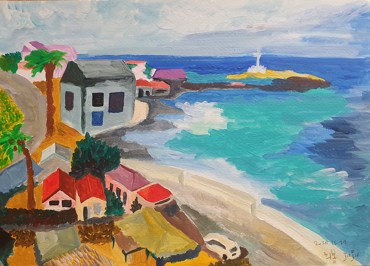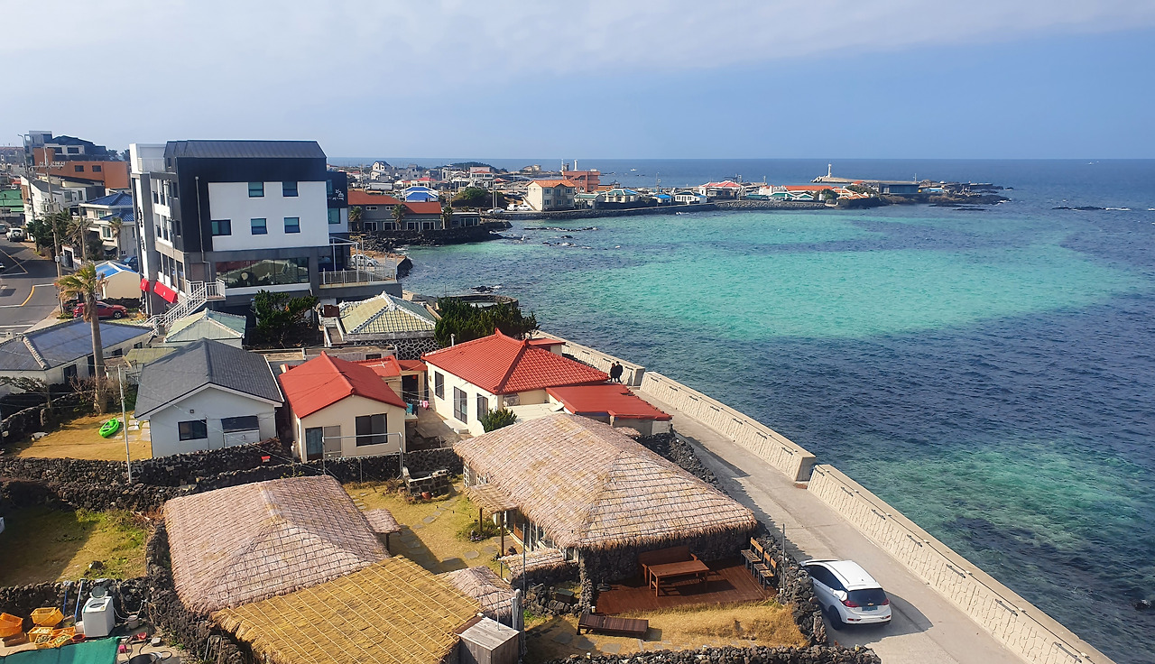 @ 늘 찾게 되는 제주 금능의 바다 옆 마을로, 내가 좋아하는 전망이다. 에메랄드 빛 바다와 돌담으로 길과 집을 구분한 마을의 지붕은 각기 다른 색깔과 소재를 갖고 있다.