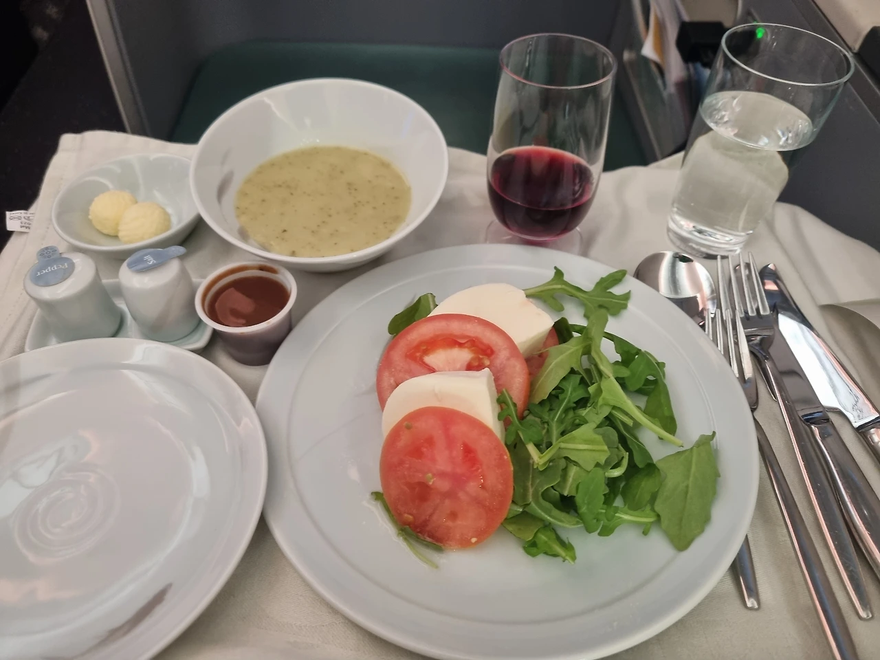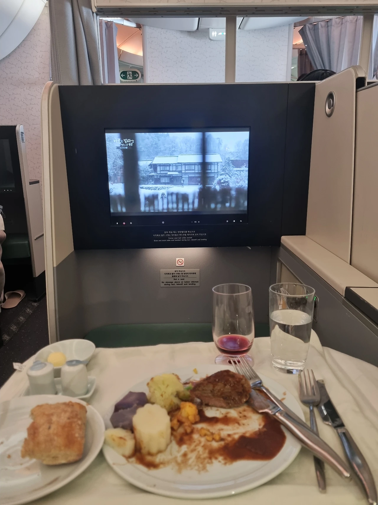 비지니스 스위트 좌석은 완전히 눕혀지는 좌석으로 편히 침대에 누워있을 수 있고, 제공되는 주류가 꽤 다양했다.
