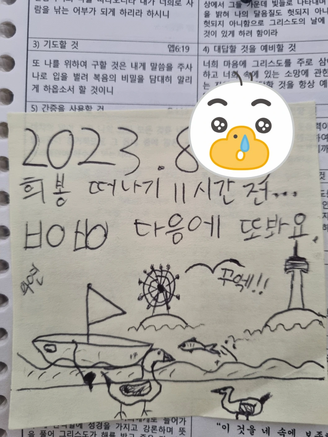 하지만, 솔직히 말하면 몇 번이고 울컥했던, 귀국날이다. 다 필요없다 사실....... 토론토에 두고온 가족 때문에 내 얼굴은 잠금장치 없이 흐르는 수돗물처럼 결국에 눈물 바다가 됐다..서러웠다. 비행기에 타고나서 조카가 남긴 그림 메시지를 발견했다. 면세점 초입에서 토론토 시내와 호수를 담은 좌석 기념품을 사지는 않고 사진을 찍어왔는데, 놀랍게도 조카의 메시지에 그대로 담겨있었다. CN타워, 갈매기, 요트, 거위, 해변,,,,